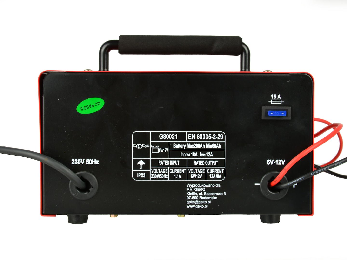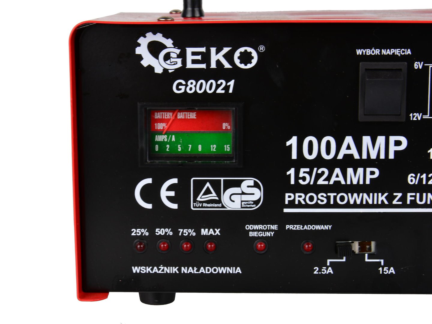 Auto punjač sa starterom, 100A, 6/12V | GEKO koristi se za punjenje i brzo oživljavanje ispražnjenih baterija u automobilima ili motociklima. Punjač s funkcijom pokretanja dizajniran je za pokretanje i punjenje olovnih baterija napona 6 V ili 12 V, koje se koriste, između ostalog, u osobnim automobilima, motociklima, plovilima itd.