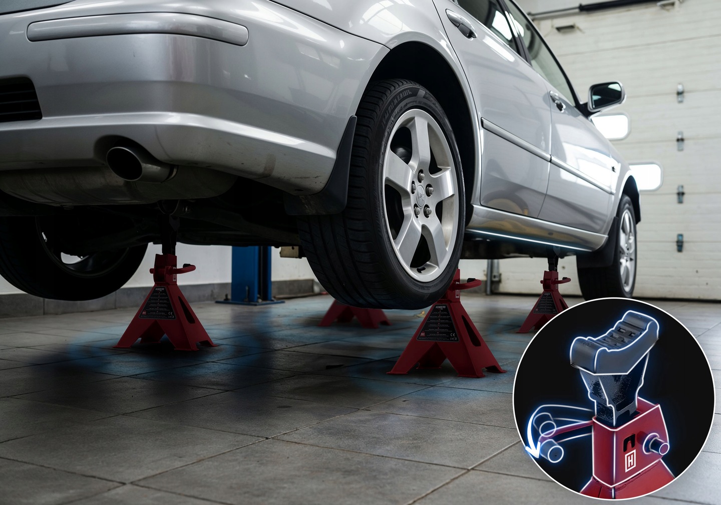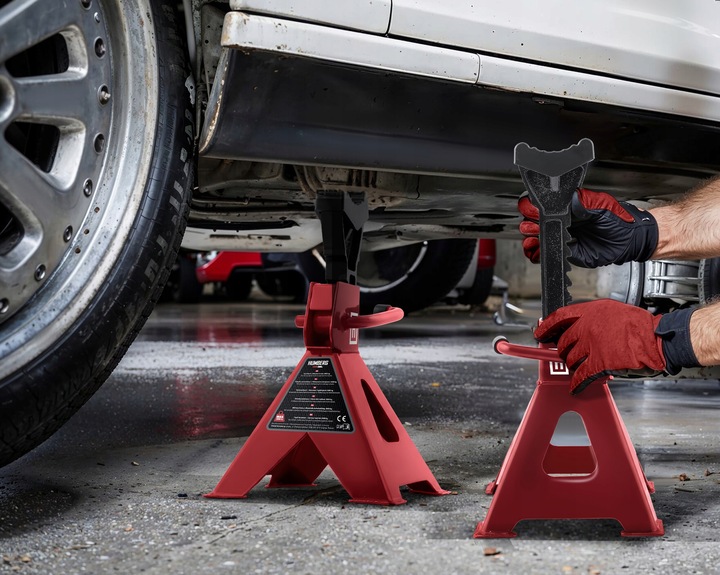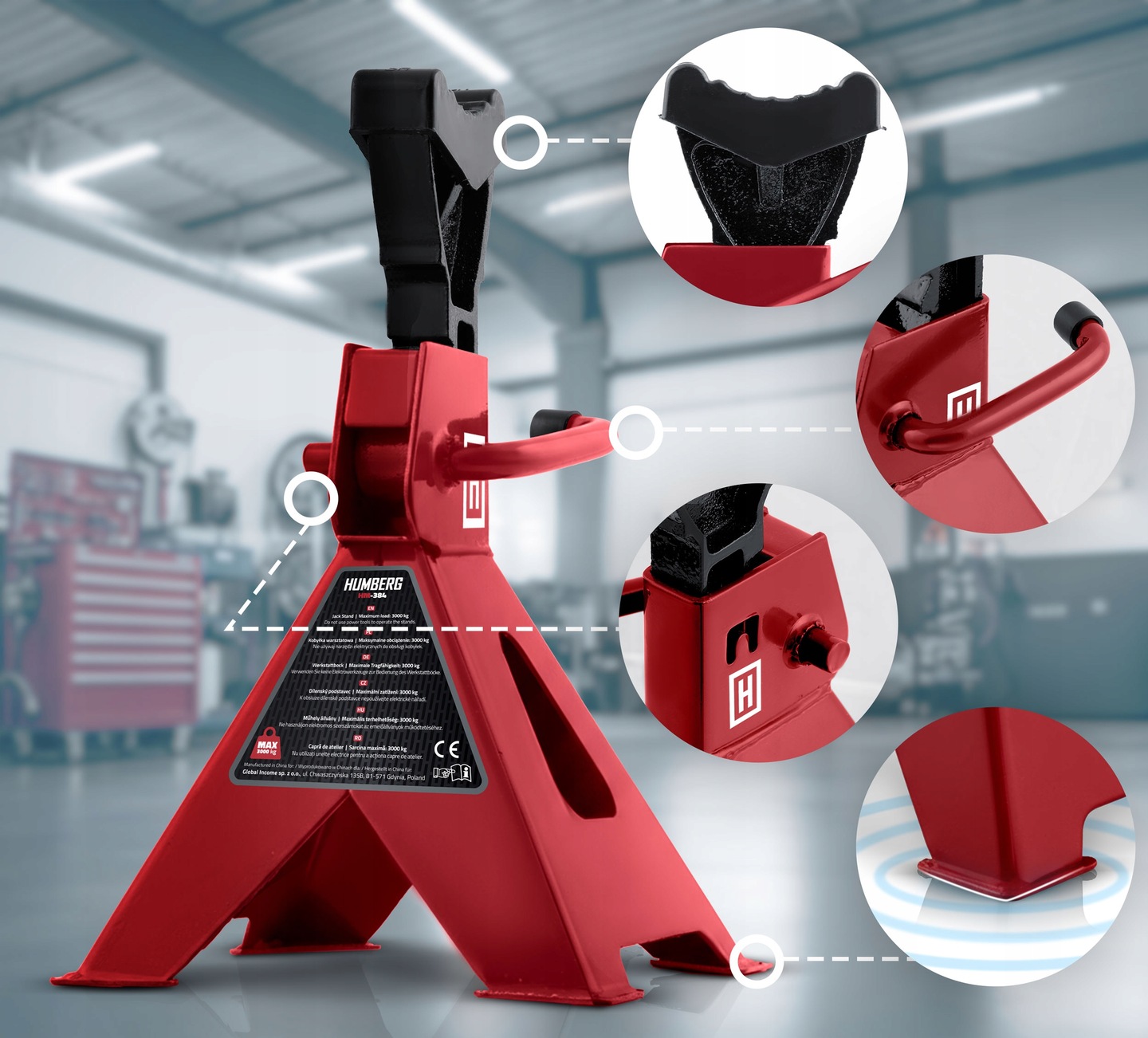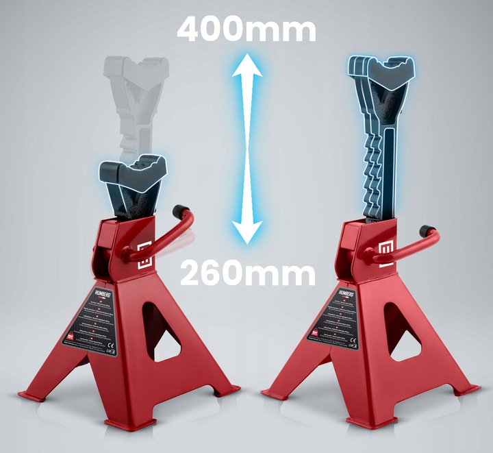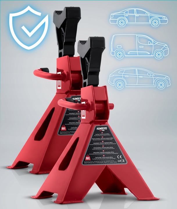 Automobilski stalci HM-384, 2 kom, 3T | Humberg su čvrsti i pouzdani nosači dizajnirani za sigurno podupiranje vozila tijekom servisnih i održavajućih radova. Robusna čelična konstrukcija pruža visoku stabilnost i sigurnost pri radu ispod automobila, što ih čini neizostavnim dijelom opreme za svaku radionicu ili garažu. Zahvaljujući mehanizmu s čegrtaljkom, nosače možete brzo i praktično podesiti na željenu visinu.