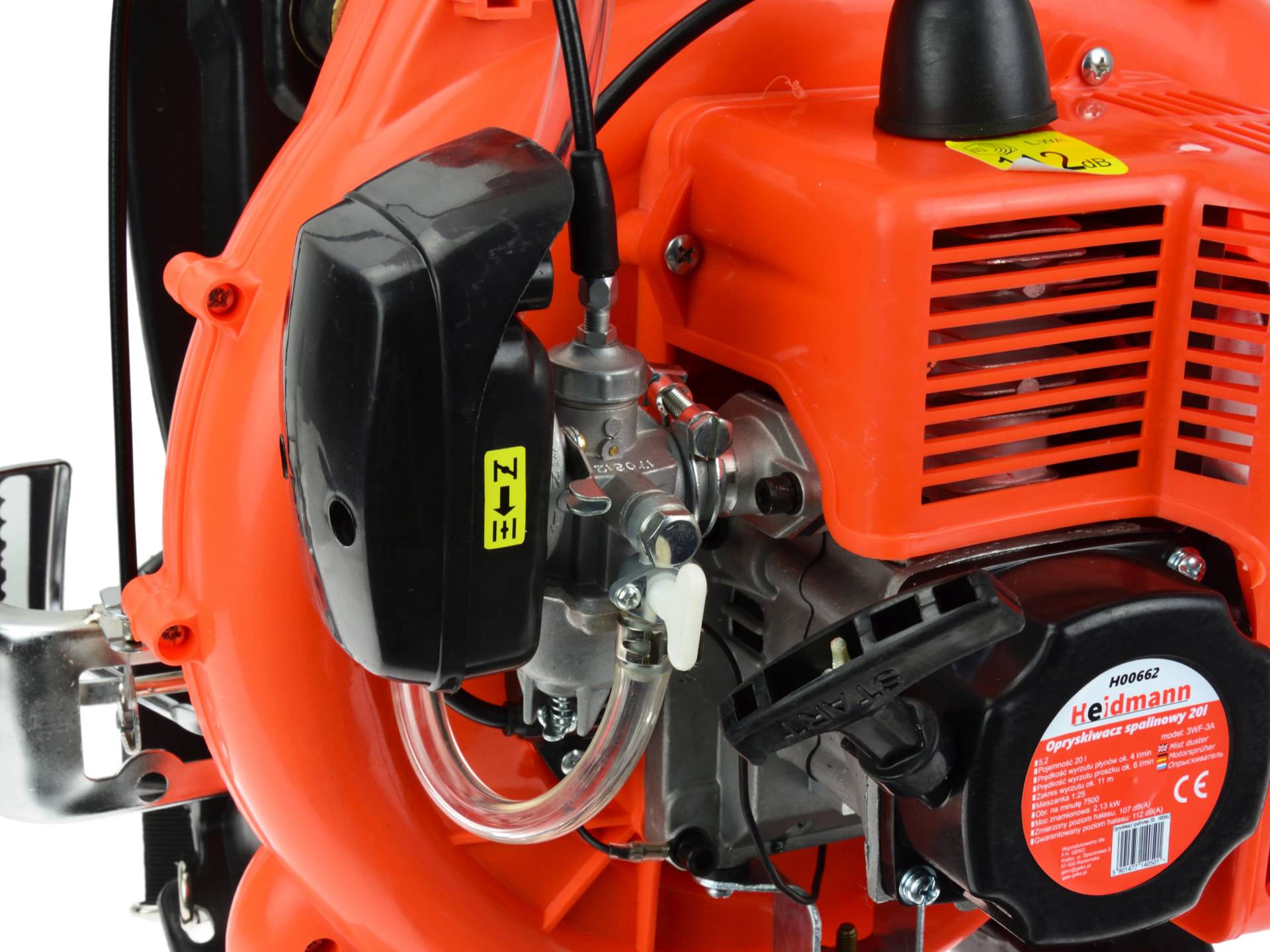 Benzinska prskalica, 20L | Heidmann s velikim spremnikom za učinkovitu primjenu tekućina i granula u poljoprivredi, vrtovima i šumama. Njezin pouzdan, tih, snažan i učinkovit motor idealan je za prskanje ili rasipanje gnojiva. Komponente su visoke kvalitete, zahvaljujući čemu motor ne uzrokuje prekomjerne vibracije. Kapacitet prskanja je približno 4 litre tekućine u minuti rada. Cijeli uređaj je postavljen na mekane gumene podloge, tako da vibracije gotovo nećete osjetiti.