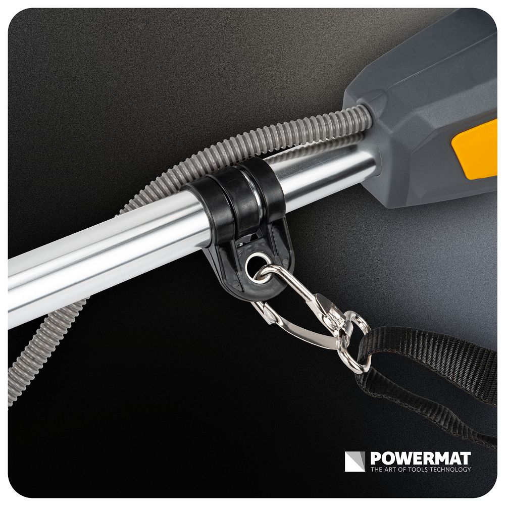 Držač karabin omogućuje vam brzo pričvršćivanje remena koji vam rasterećuju ruke tijekom rada. Zahvaljujući tome možete bolje rasporediti težinu uređaja i raditi dulje bez umora. Ne morate se naprezati s teškom, bučnom motornom kosilicom – ovdje imate malu težinu od oko 5,3 kg, bez trzaja pri pokretanju i jednostavno rukovanje odmah nakon uključivanja. Nakon rada, ručku možete preklopiti na pola. To olakšava pohranu uređaja čak i u malom prostoru.