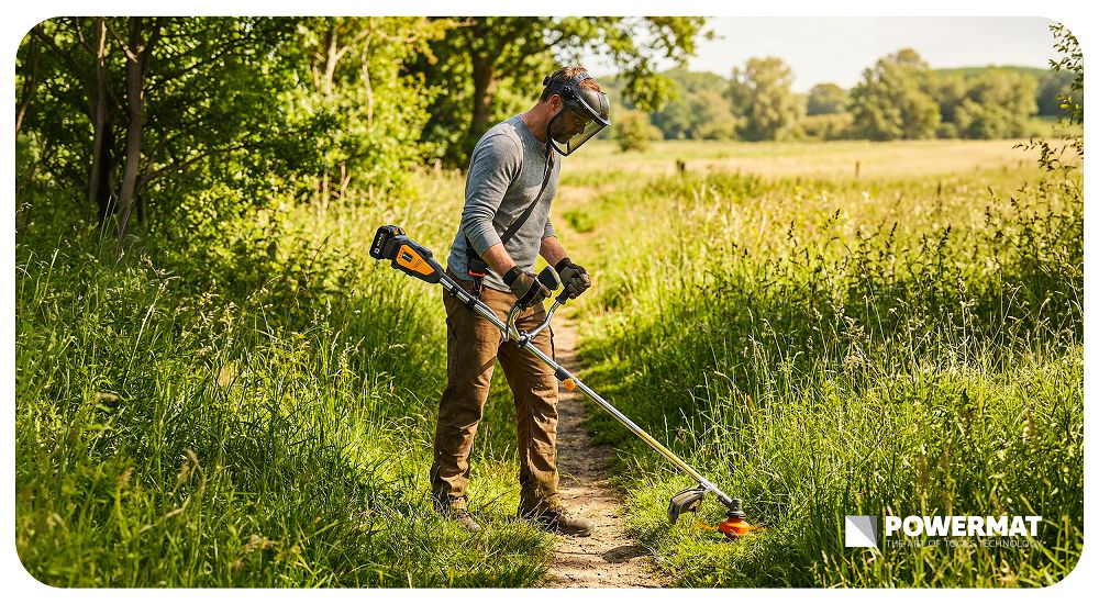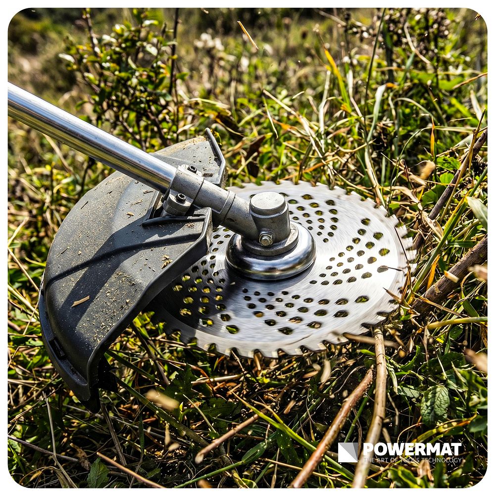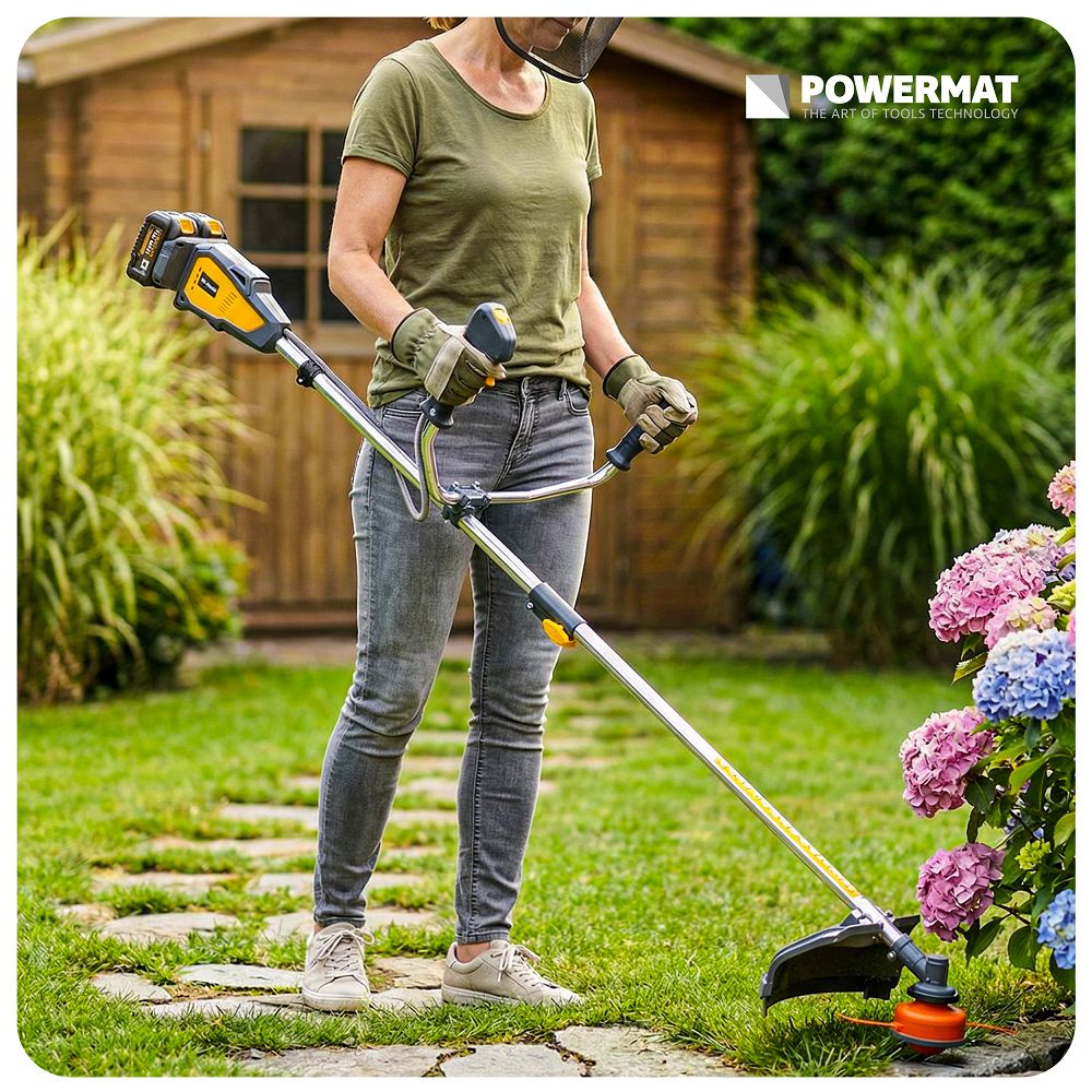 Bežična kosilica, 42V, 380mm | PM-KSAK-42VM olakšava košnju rubova travnjaka, uklanjanje grmlja i košnju cijelog vrta. Zahvaljujući velikom promjeru rezanja i kontroli brzine, radite brže i udobnije. Nema ispušnih plinova, niža buka i odsutnost kabela povećavaju udobnost, a vi dobivate slobodu i čišći rad. Napon od 42 V i širina rezanja od 380 mm omogućuju vam bržu košnju veće površine. Lagani dizajn i remen za nošenje smanjuju umor tijekom duljeg rada.