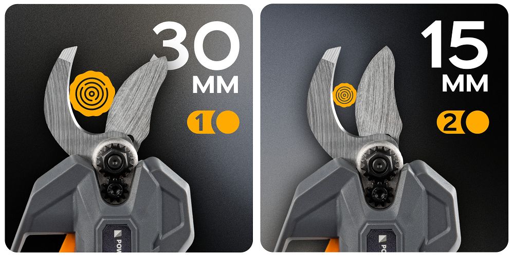 Visoka sila rezanja znači jedno povlačenje okidača umjesto napornog korištenja ručnog alata. Kaljene oštrice prave čist rez bez oštećenja biljaka. Štedite vrijeme i smanjujete napor tijekom intenzivnog rada. Dva radna raspona oštrice 15 mm i 30 mm omogućuju vam podešavanje širine otvora vrsti grane. Način rada možete brzo promijeniti držanjem okidača bez prekidanja rada.