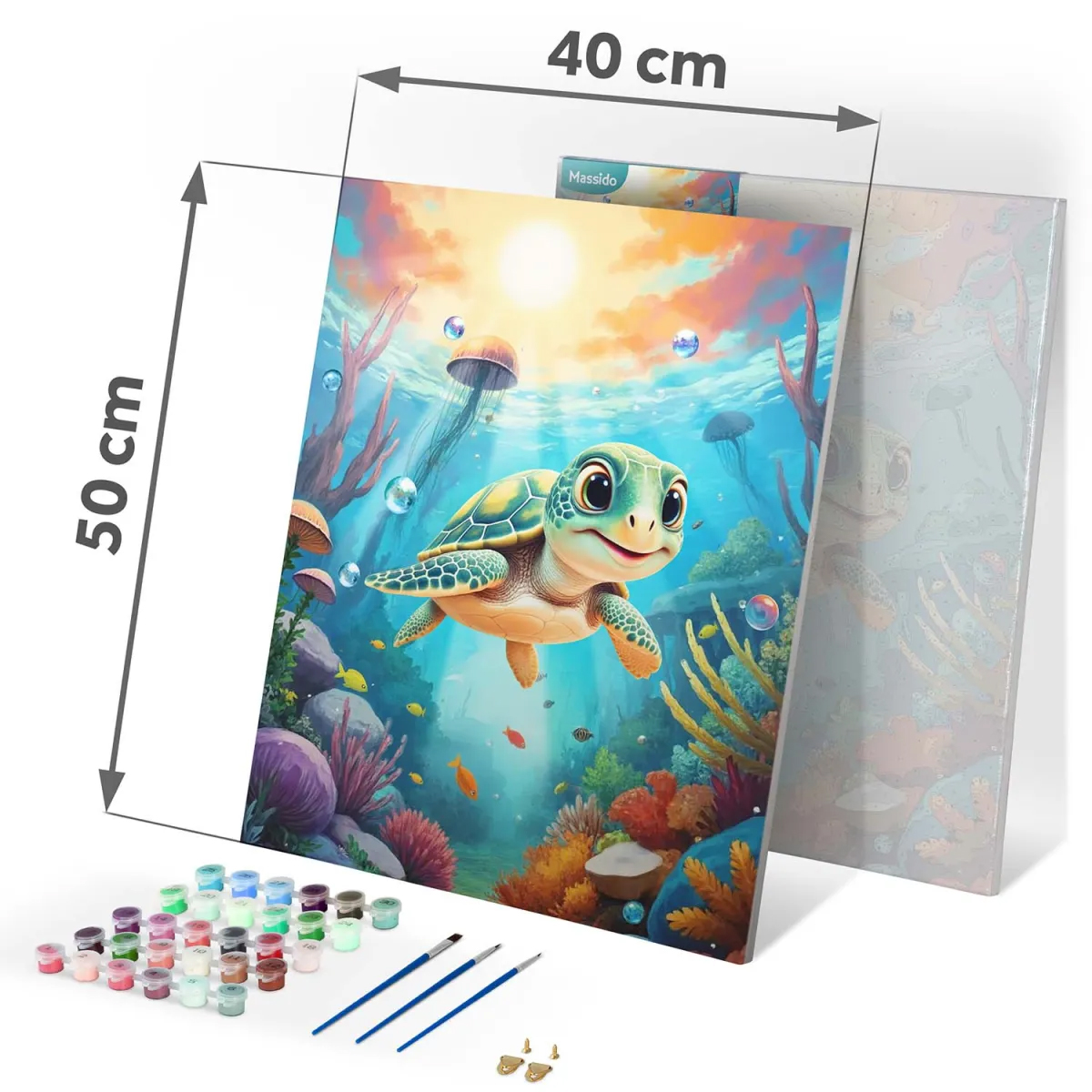 Boja po brojevima, 40x50cm, kornjača | Massido je set koji vam omogućuje opuštanje dok ispunjavate okvire bojama i stvarate vlastito umjetničko djelo. Vesel, šareni uzorak odličan je izbor za velike i male umjetnike koji žele otkriti radost slikanja. Idealno za provođenje kreativnog vremena s obitelji i stvaranje jedinstvenog umjetničkog djela punog boja!
