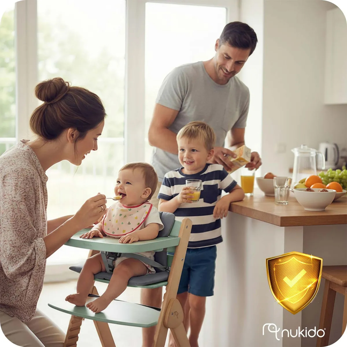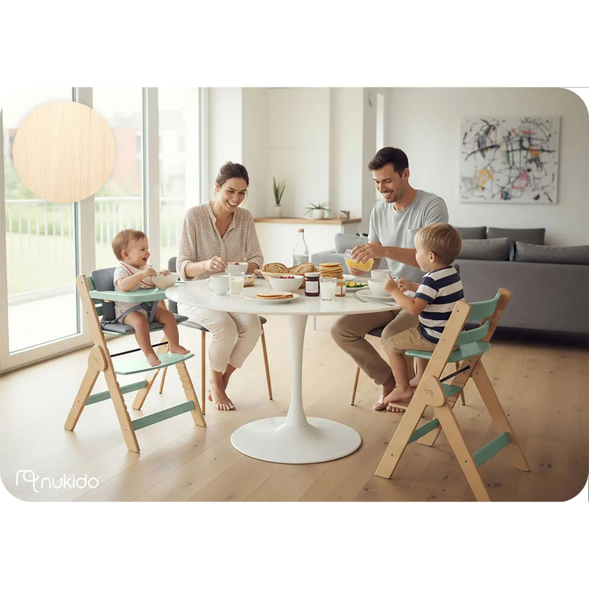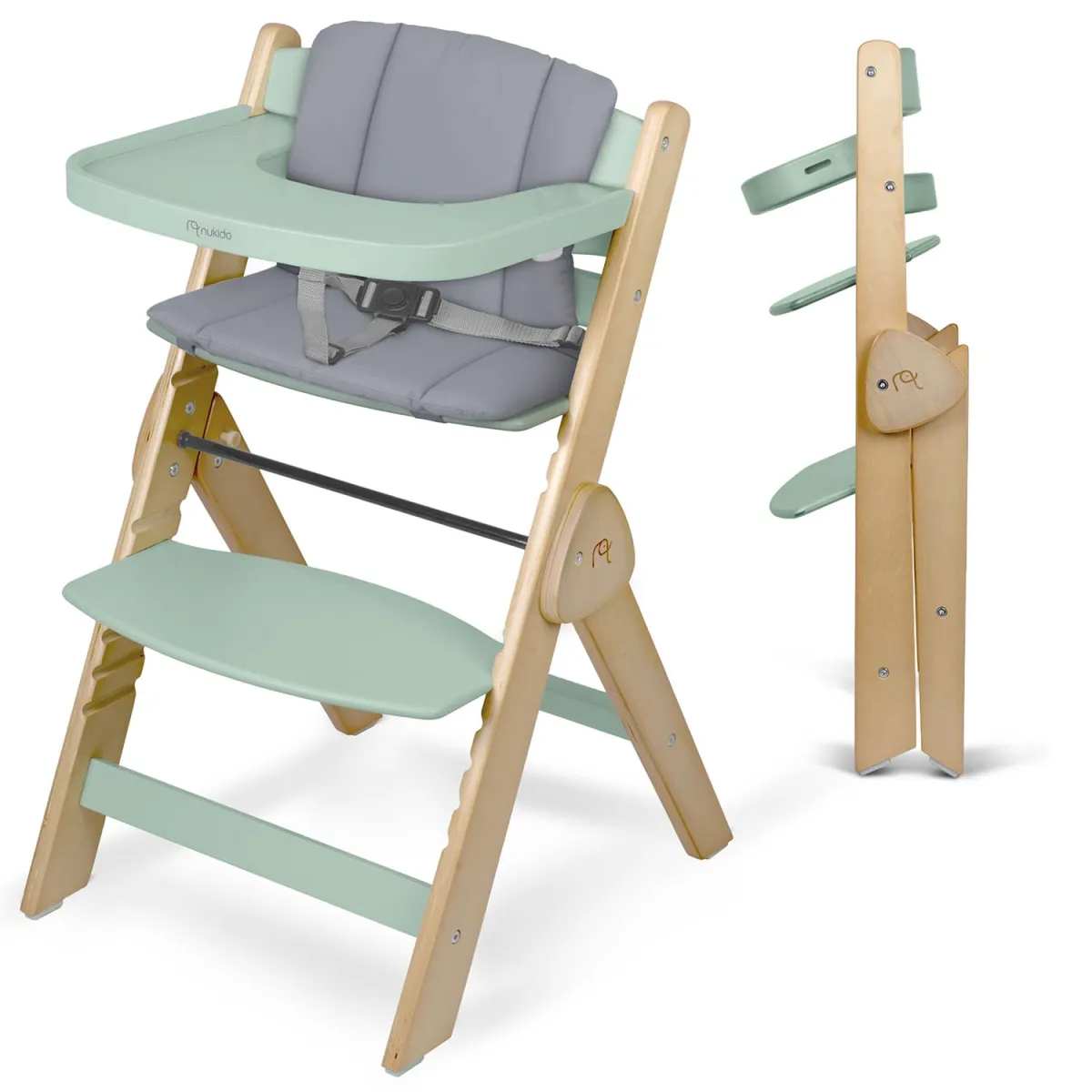 Dječja blagovaonska stolica Timo 2-u-1, zelena | Nukido je stabilna i sigurna stolica za hranjenje koja podržava udobno i samostalno sjedenje za stolom. Zahvaljujući posebnom setu sigurnosnih pojaseva i udobnom jastuku, postaje sigurna i udobna prva stolica za vaše dijete. Idealna za prve obroke i zajedničke trenutke za stolom. Ako vaše dijete odraste, jednostavno uklonite pladanj i podesite visinu sjedala i oslonaca za noge.