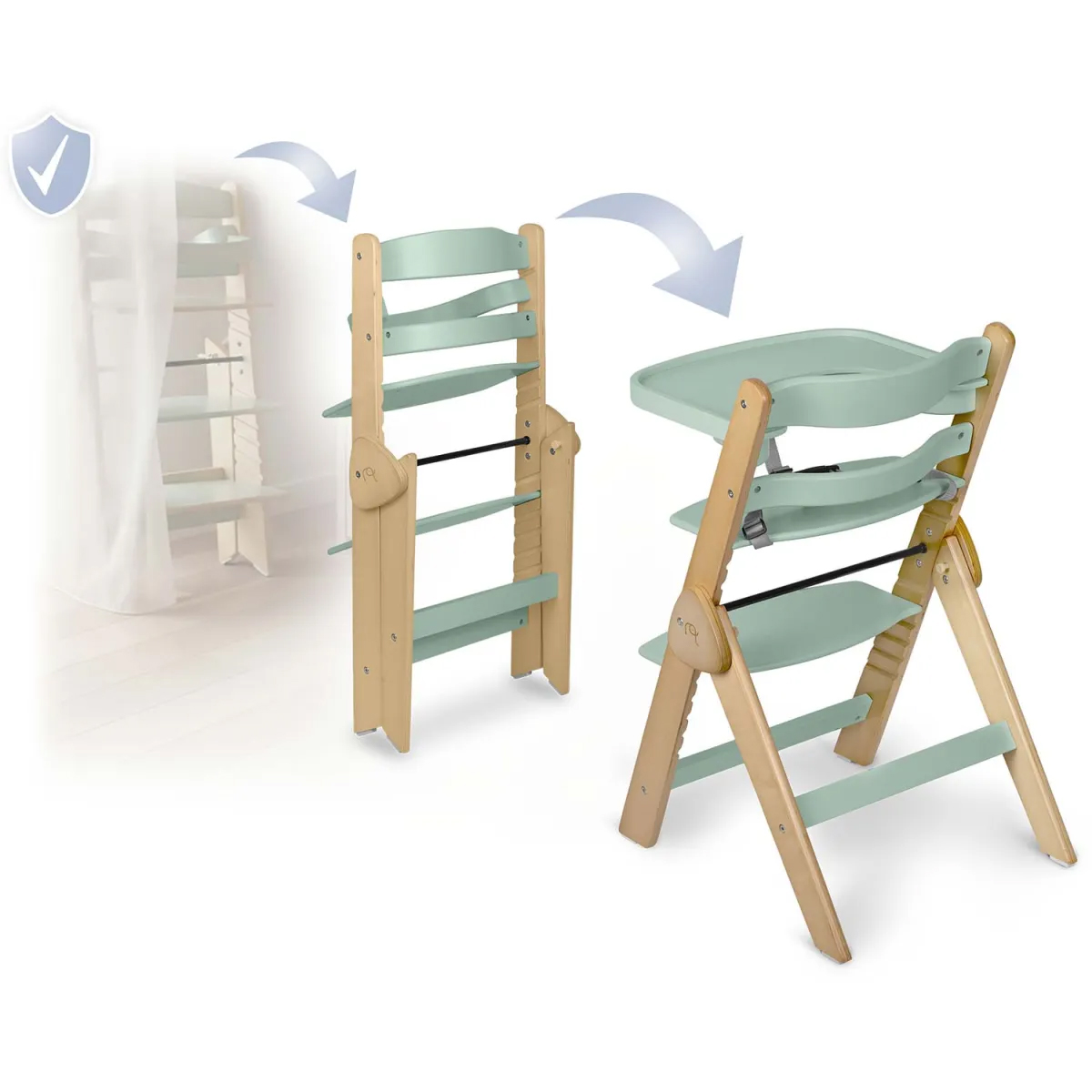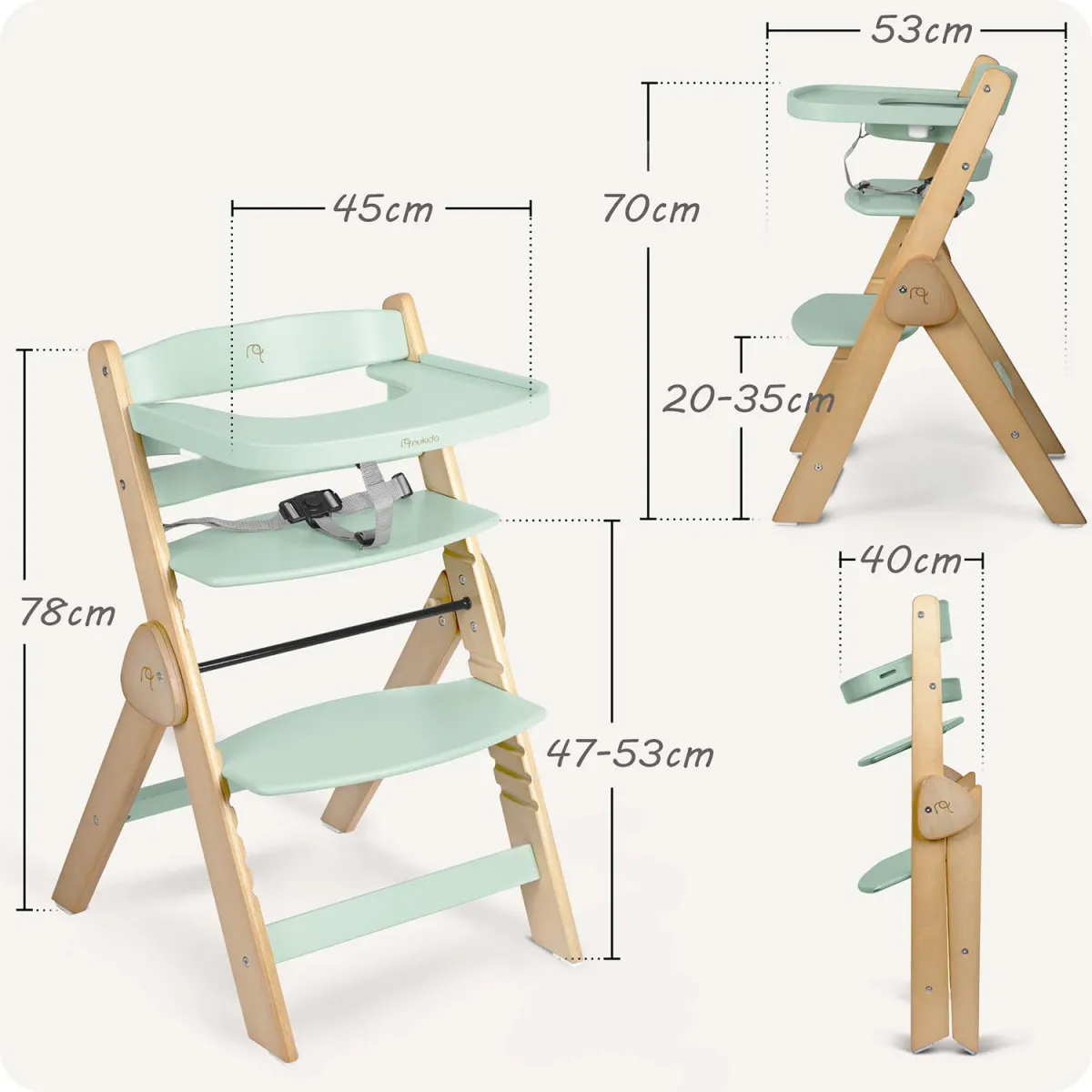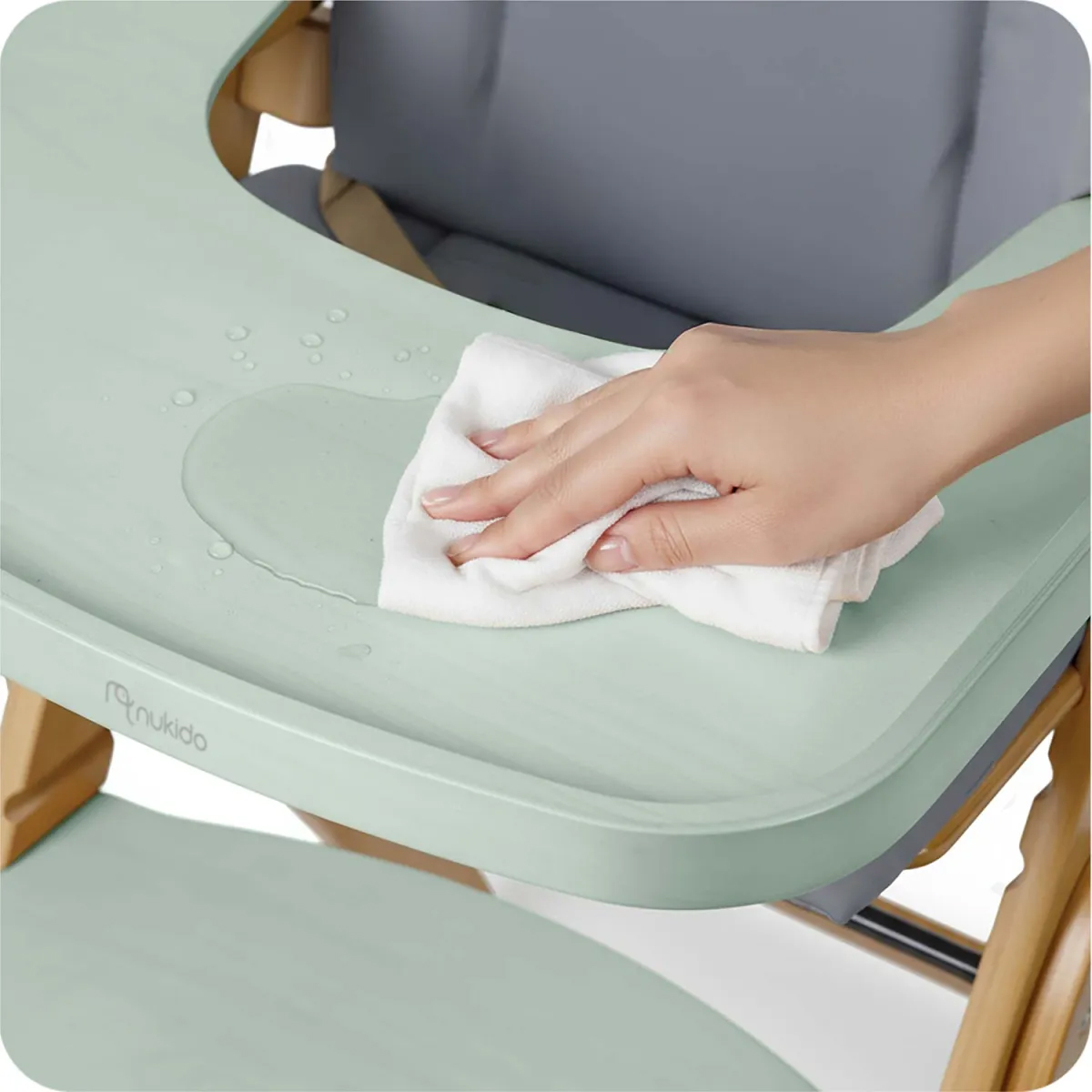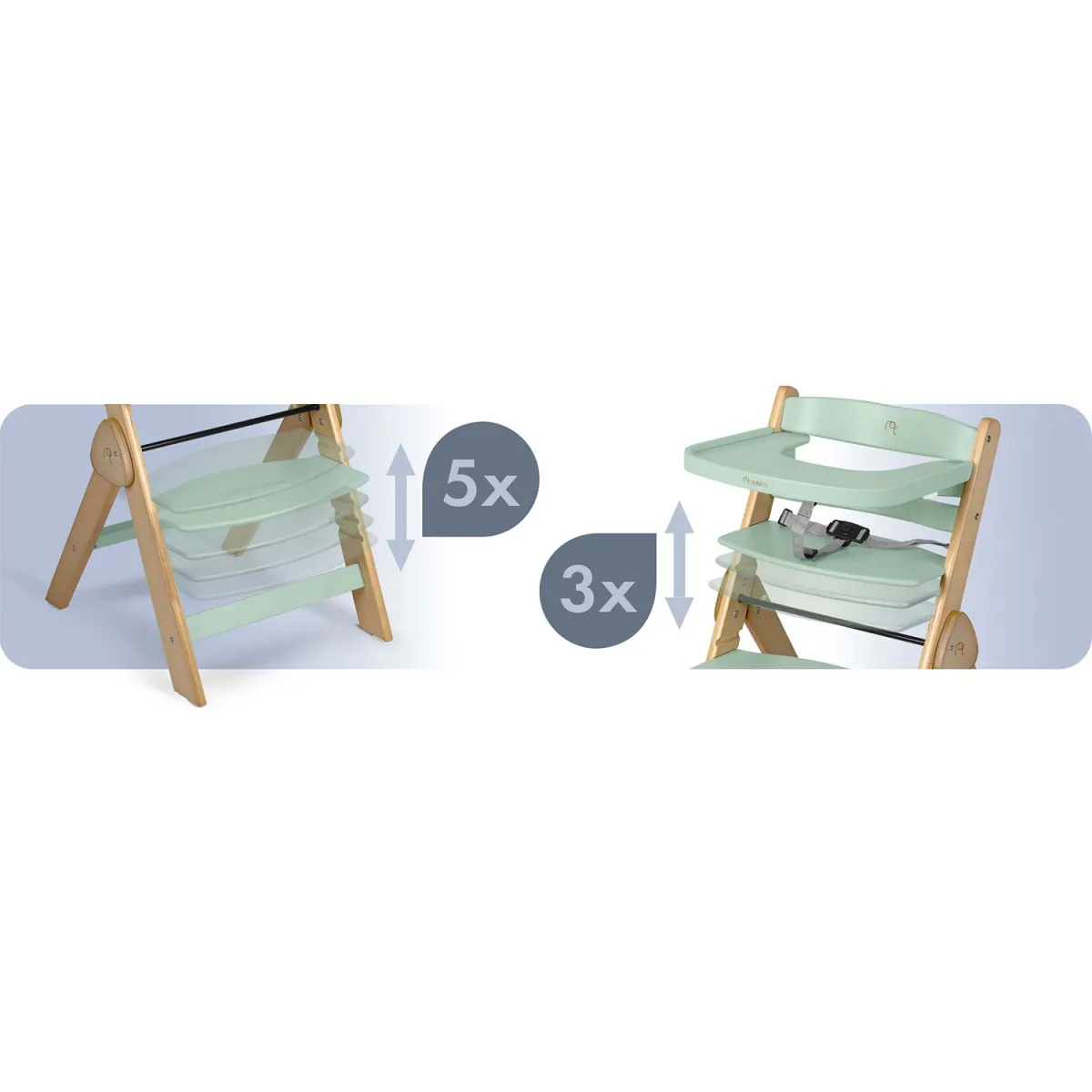 Dječja blagovaonska stolica Timo 2-u-1, zelena | Nukido je stabilna i sigurna stolica za hranjenje koja podržava udobno i samostalno sjedenje za stolom. Zahvaljujući posebnom setu sigurnosnih pojaseva i udobnom jastuku, postaje sigurna i udobna prva stolica za vaše dijete. Idealna za prve obroke i zajedničke trenutke za stolom. Ako vaše dijete odraste, jednostavno uklonite pladanj i podesite visinu sjedala i oslonaca za noge.
