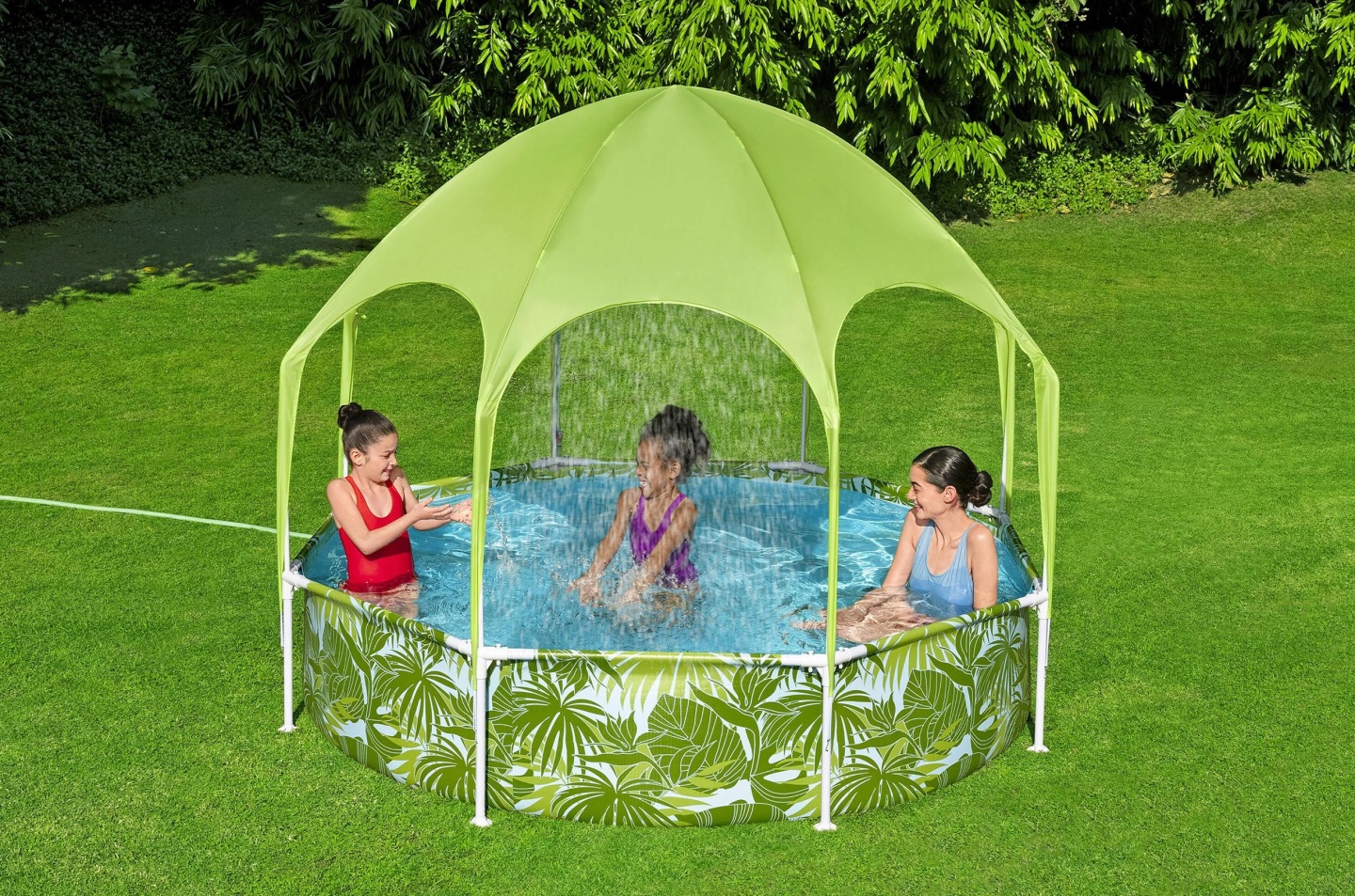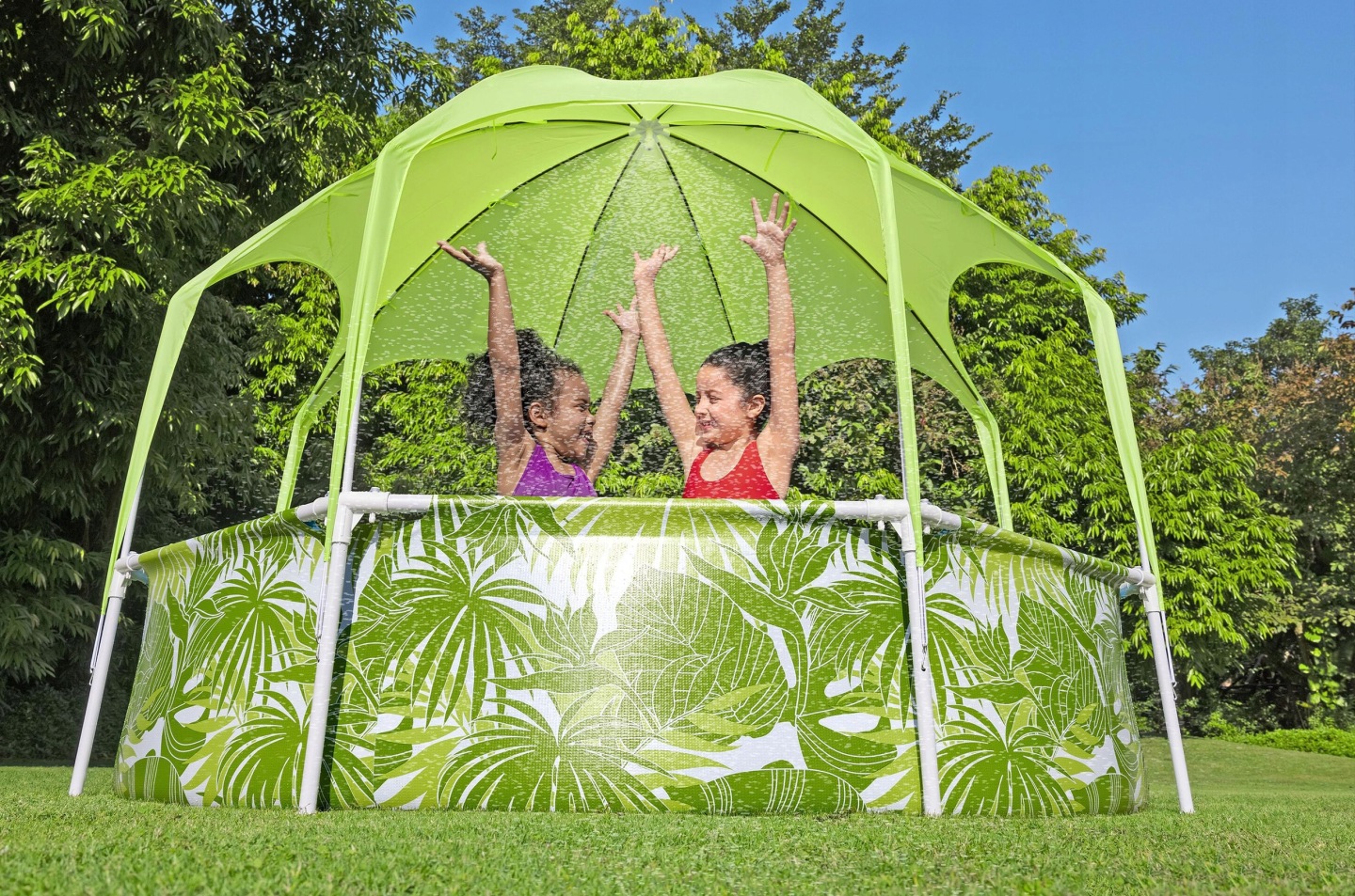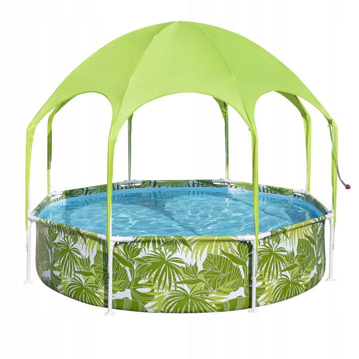 Dječji bazen s nadstrešnicom, 244x51cm | Bestway nudi praktično rješenje za ljetno osvježenje, a istovremeno pruža zaštitu od sunca tijekom plivanja. Čvrsta metalna konstrukcija osigurava stabilnost i izdržljivost u korištenju. Integrirana nadstrešnica pruža zaštitu od sunčeve svjetlosti i povećava udobnost pri plivanju u vrućim danima. Također uključuje raspršivač vode, koji, kada se spoji na vrtno crijevo, boravak u bazenu čini ugodnijim. Izdržljive stijenke izrađene od višeslojnog materijala osiguravaju dulji vijek trajanja i sigurnu upotrebu.