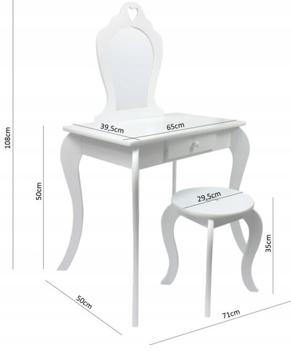 Ovaj toaletni stolić dizajniran je s mogućnošću pričvršćivanja na zid radi povećane stabilnosti, što je posebno povoljno u dječjoj sobi. Sveukupno, ovo je idealan komad namještaja za malu žensku zonu – bilo za djevojčicu koja žudi za vlastitim “dnevnim boravkom” ili kao dodatak elegantnom interijeru. Ne samo da će očarati svojim šarmantnim izgledom, već i razvija kreativnost i uči redu u dječjoj sobi.