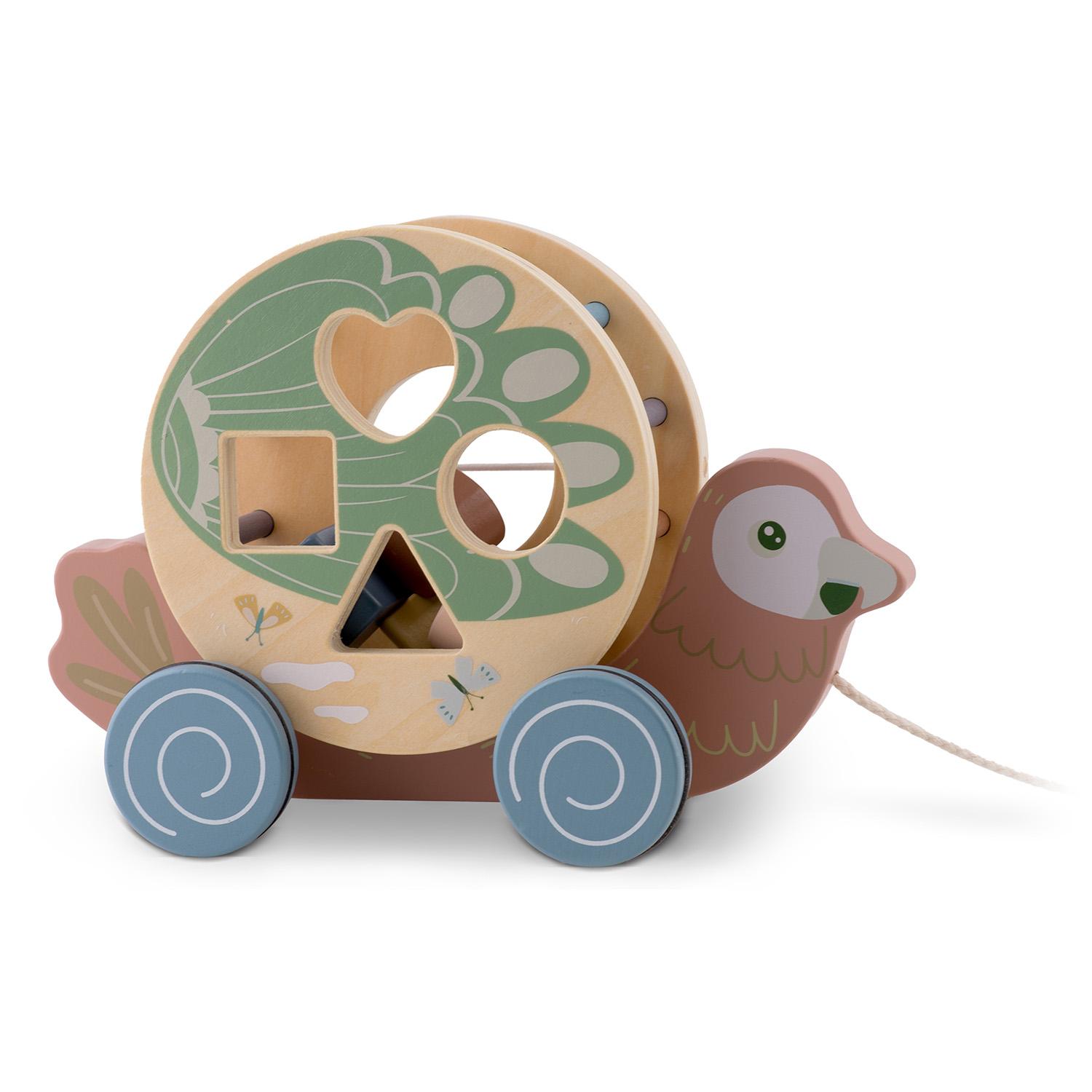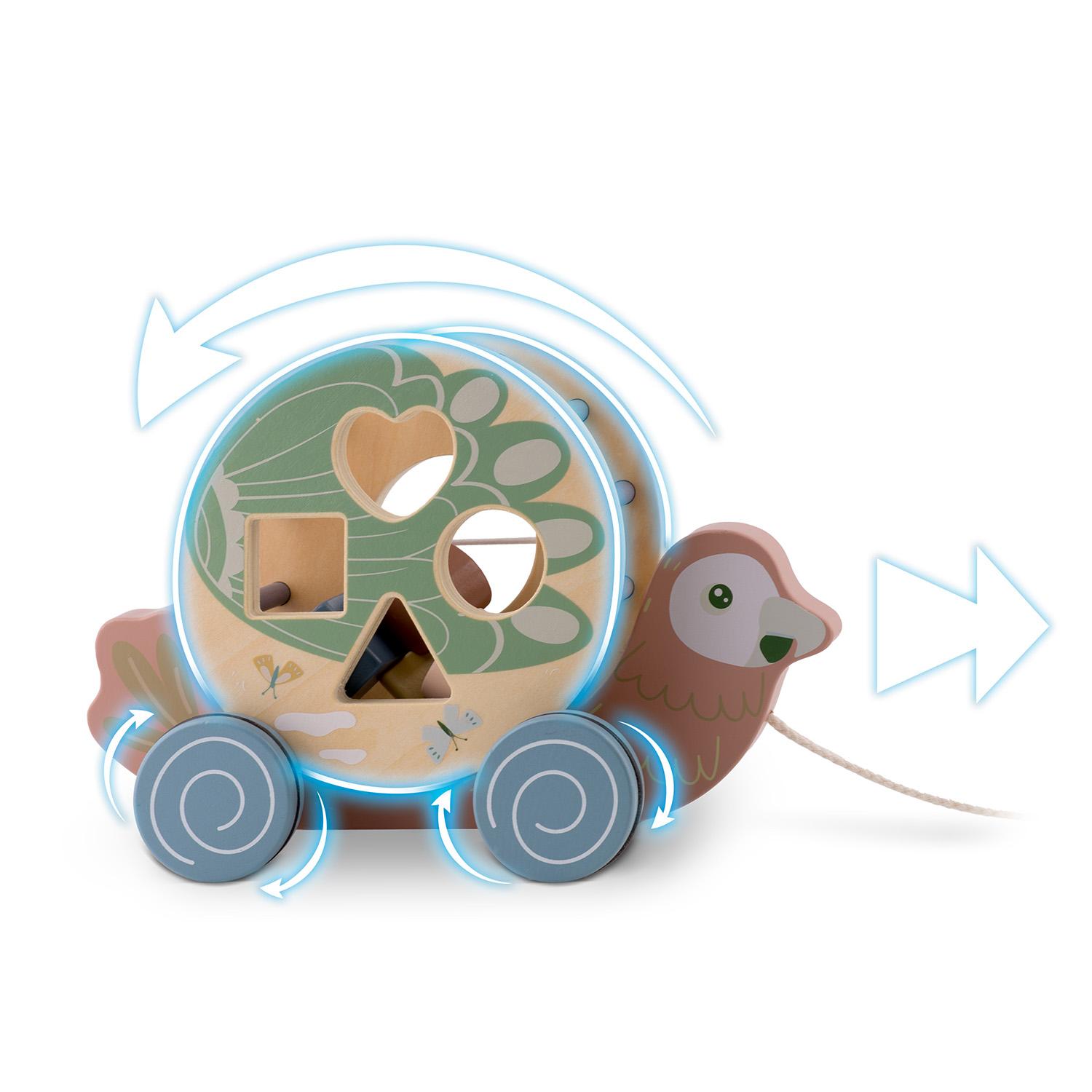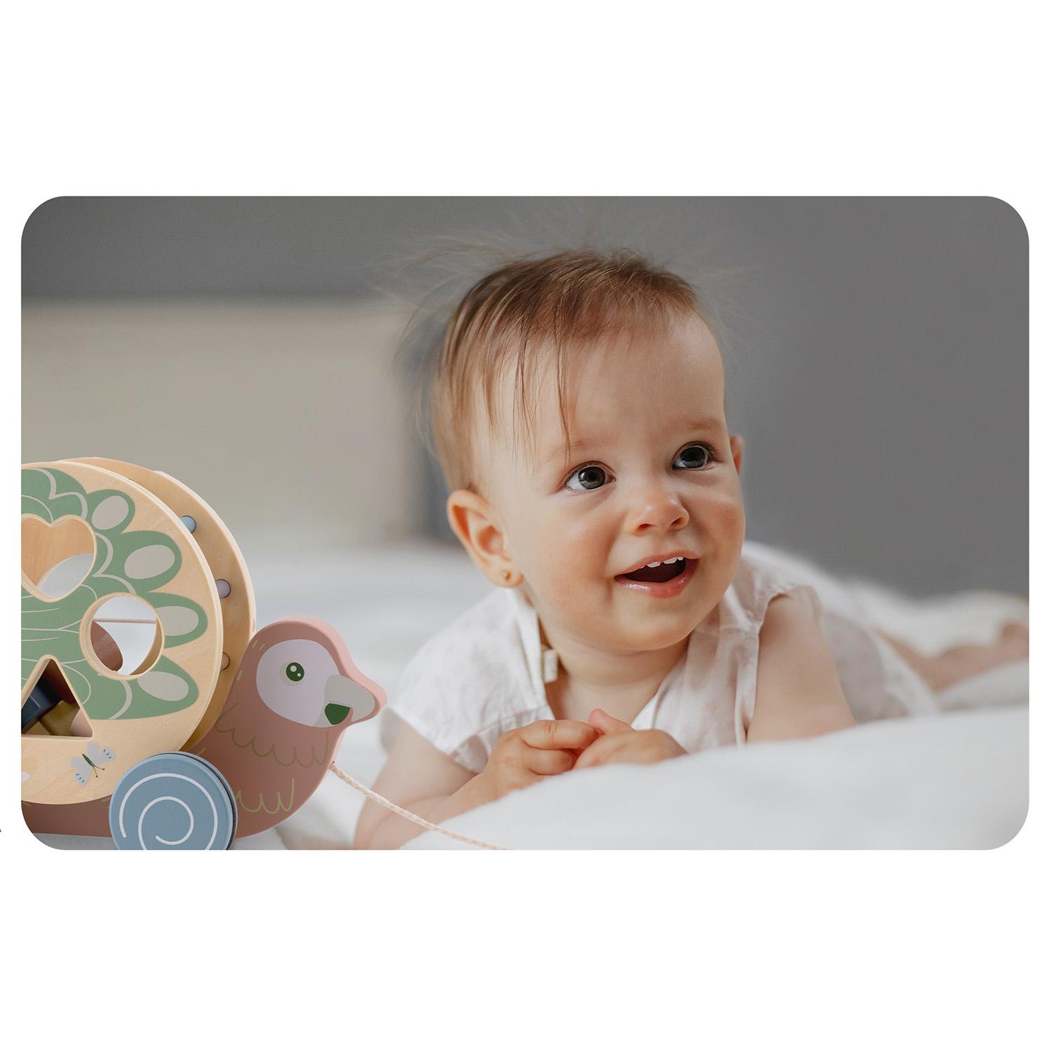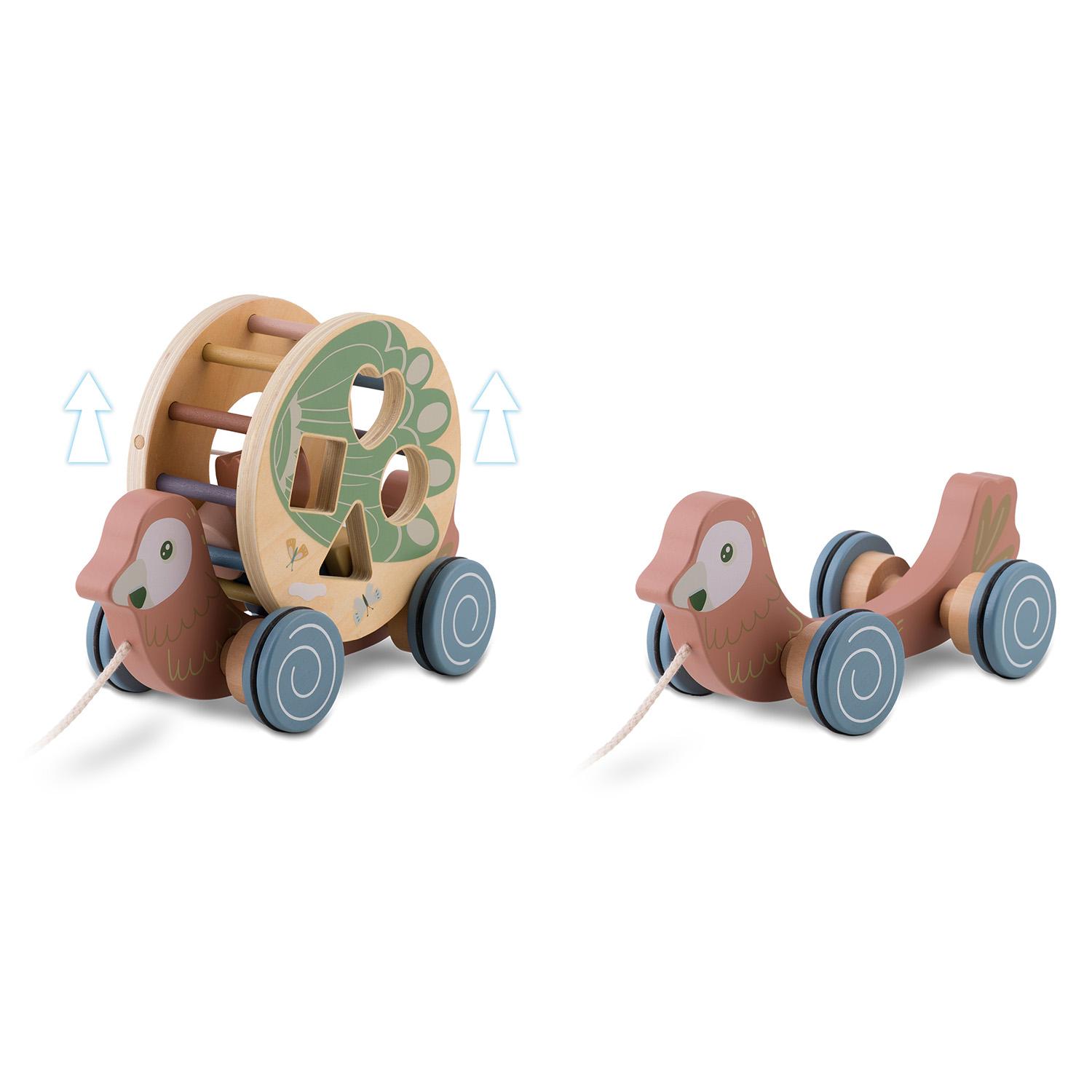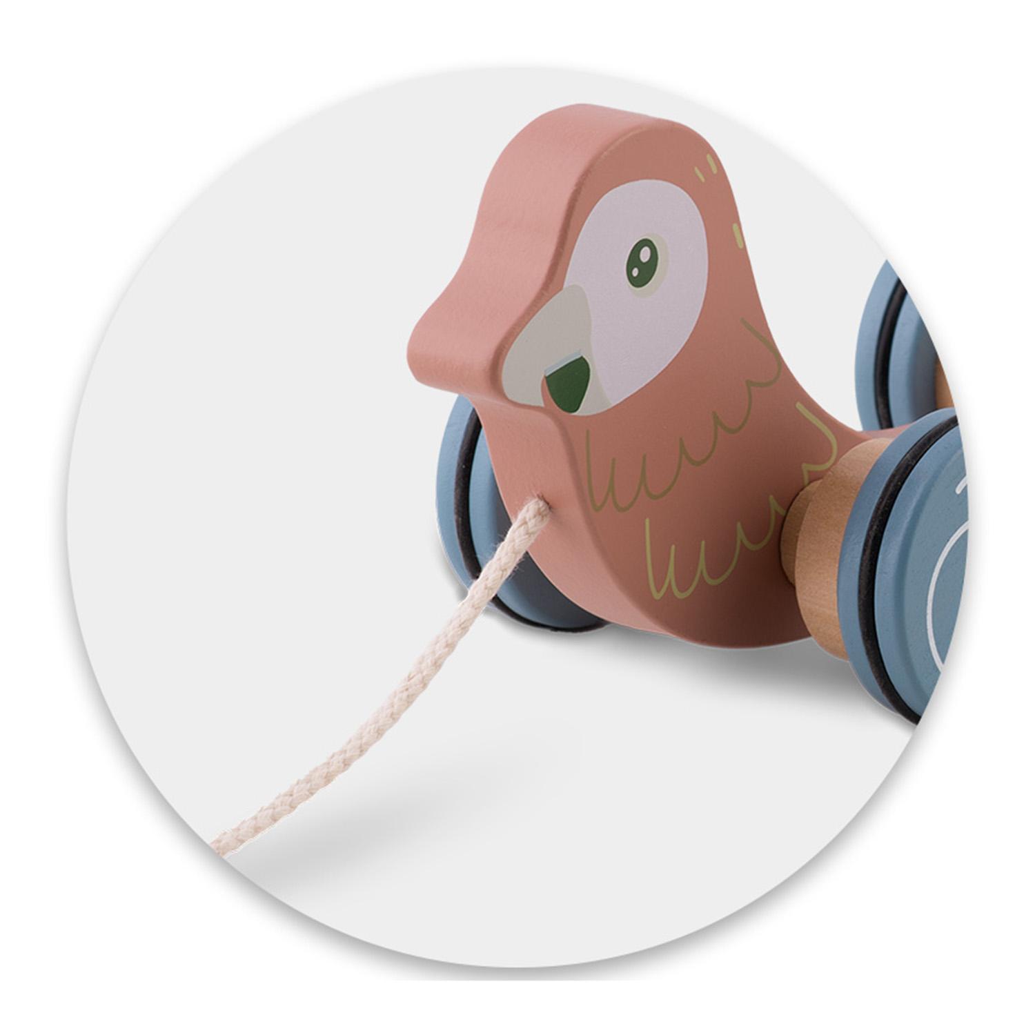 Drvena igračka za djecu NK-854, papiga | Nukido idealna je za mališane, podržavajući razvoj ravnoteže, koordinacije i prvih djetetovih koraka na razigran način. Ovaj edukativni drveni model papige na kotačima pomaže djeci da prate kretanje povlačenjem uzice i postupno grade svoje prvo razumijevanje uzroka i posljedice – kada igračka ide naprijed, kotači se okreću, a mehanizam unutra pomiče sorter boja na leđima papige.