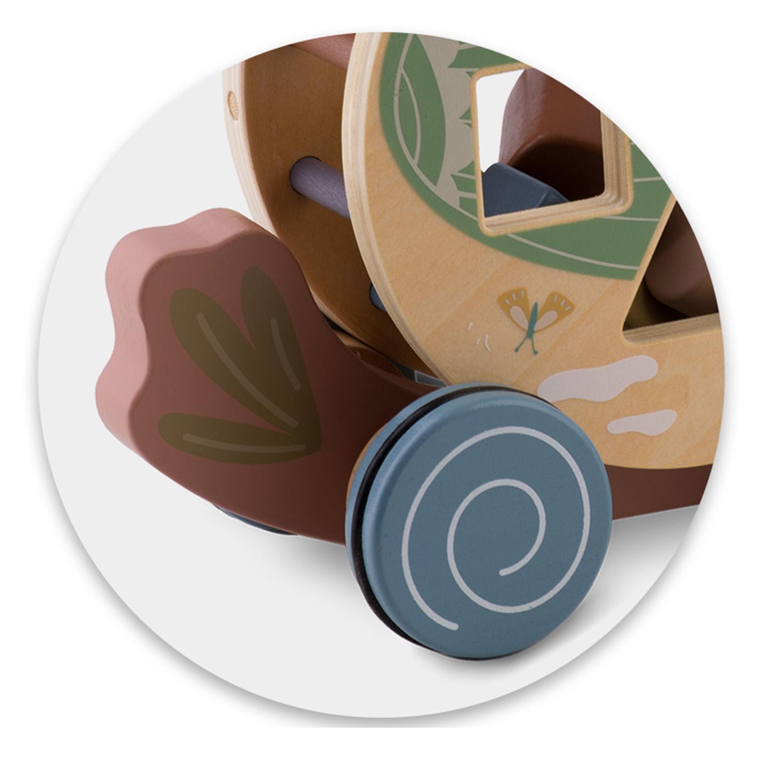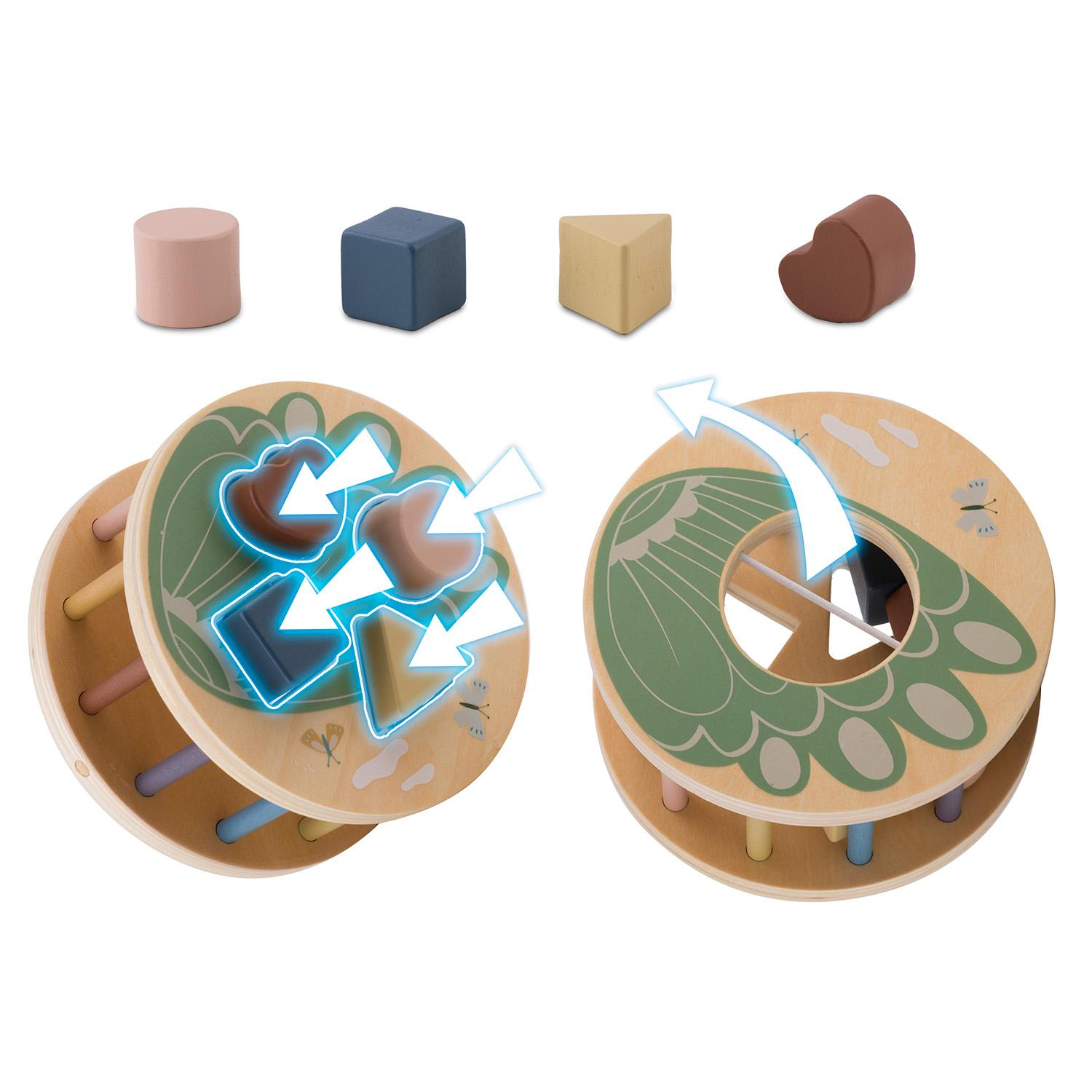 Sorter blokova može se ukloniti i koristiti zasebno, što igrački daje drugu funkciju – podršku prepoznavanju oblika i boja, učenje umetanja blokova u ispravne rupe i rad s finom motorikom. Igračka je izrađena od prirodnog drva sa sigurnom obojenom površinom i certificiranim materijalima prema europskim standardima (npr. EN 71), pa osigurava sigurnu upotrebu za djecu od otprilike 12 mjeseci.
