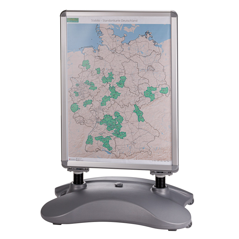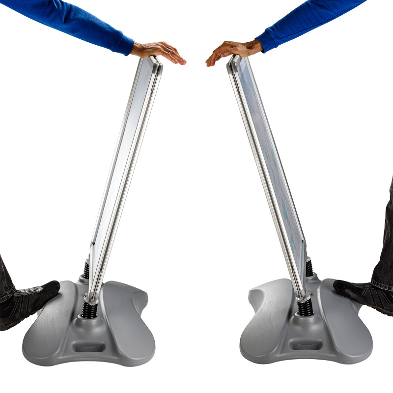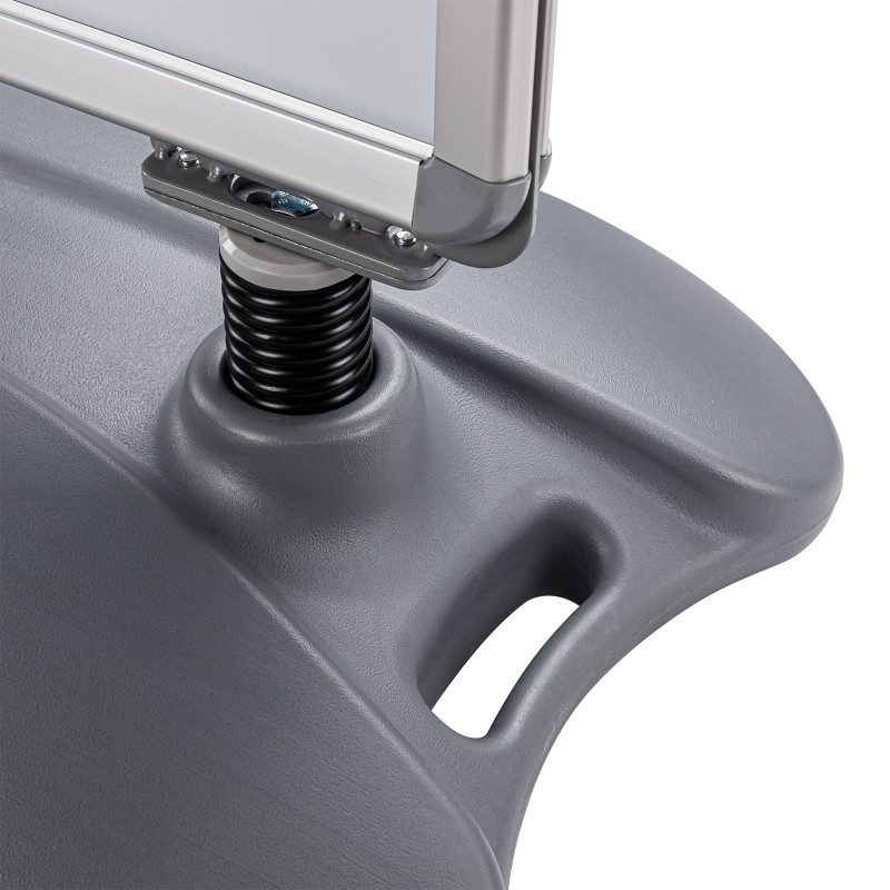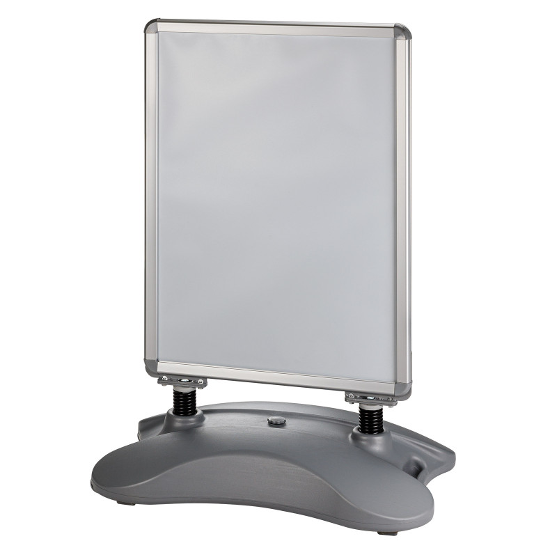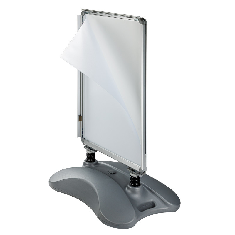 Bočne ručke i integrirani kotači omogućuju jednostavno pomicanje stalka jednostavnim naginjanjem. Stabilni nosači pružaju potrebnu fleksibilnost pri vjetru i lošem vremenu. Zbog toga je prikladan za unutarnje i vanjsko oglašavanje. Brza montaža bez upotrebe alata.