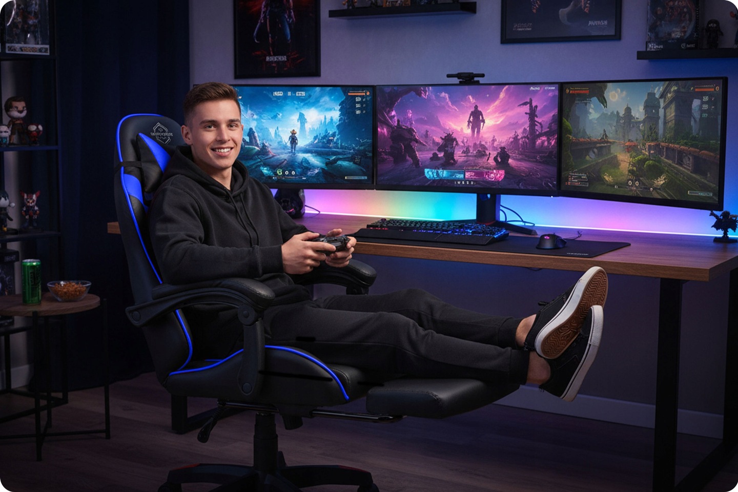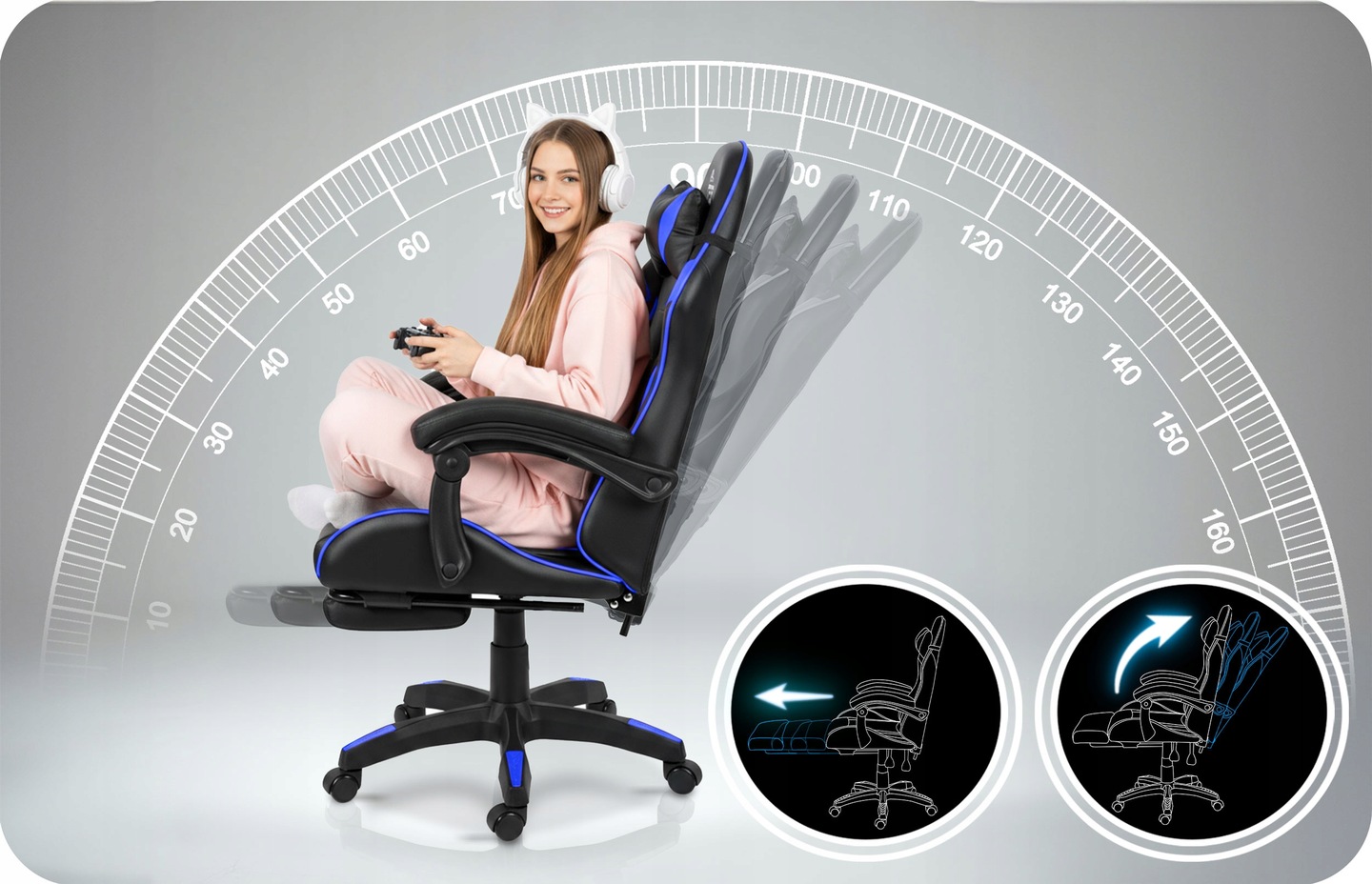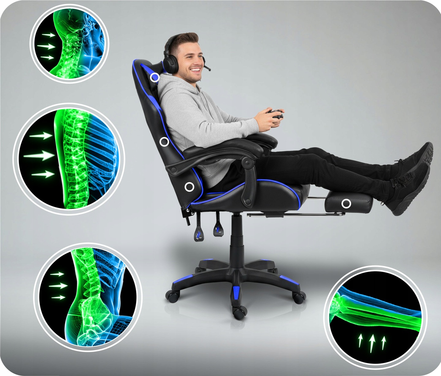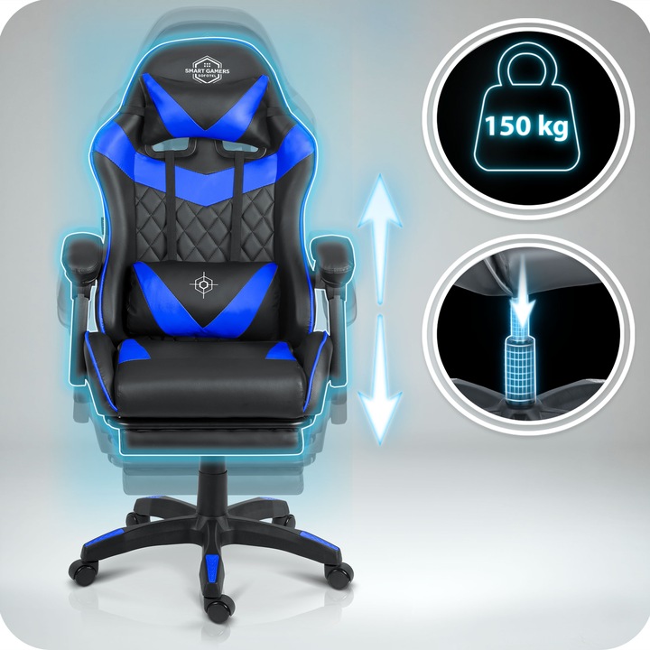Gaming stolica Draknor II, crno-plava | Sofotel je udobna stolica dizajnirana ne samo za igranje igara već i za svakodnevnu upotrebu u uredu ili kućnom okruženju. Zahvaljujući visokokvalitetnoj presvlaci i ergonomskom obliku, podržava pravilno držanje čak i pri dugotrajnom sjedenju, čime se smanjuje umor leđa i povećava udobnost.