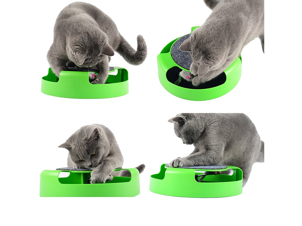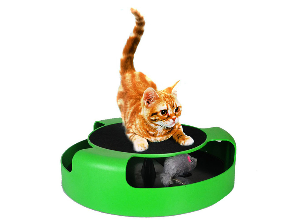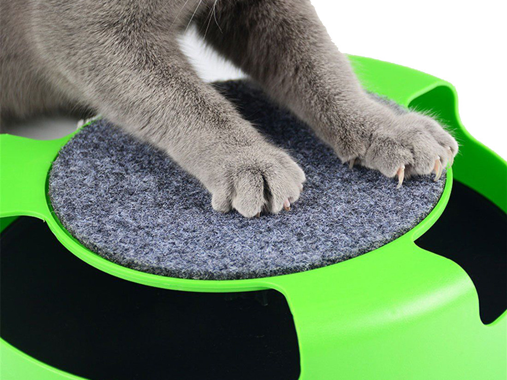 Igračka za mačke s grebalicom | 25×6,5cm namijenjena je mačkama koje vole igru i veselje, zahvaljujući ovoj atrakciji neće im biti dosadno. To je alternativa lovu u prirodnom okruženju, a istovremeno i odlična zabava za vašeg ljubimca. Igračka ima dvije funkcije koje će mačku dugo zaokupljati. Prva je miš koji trči okolo i počinje se kretati nakon što ga se dodirne šapom, a druga je kružna grebalica. Uređaj ima protuklizne jastučiće koji štite pod od grebanja. Tri velike rupe omogućuju mački da lako u njih umetne šape.