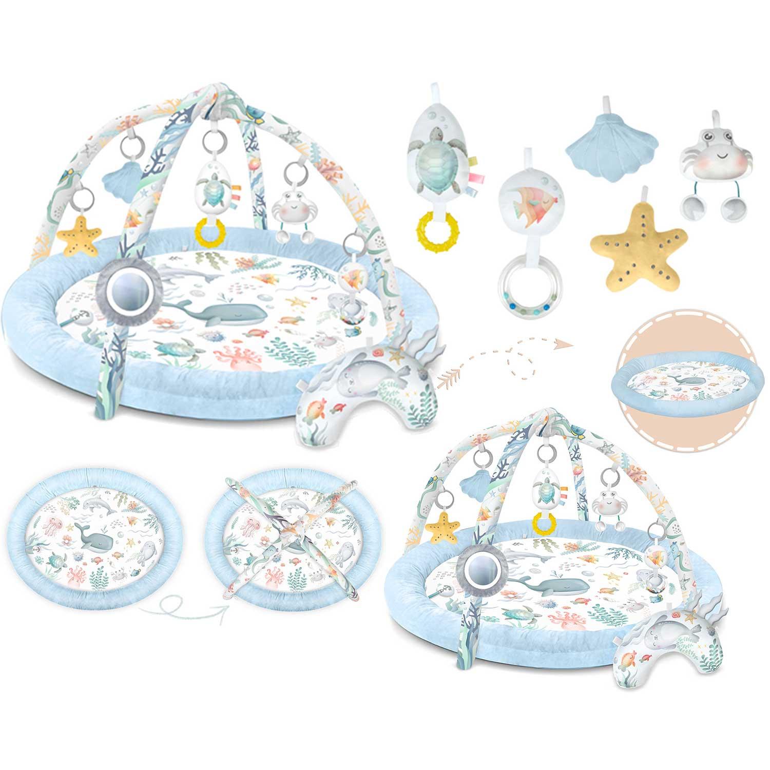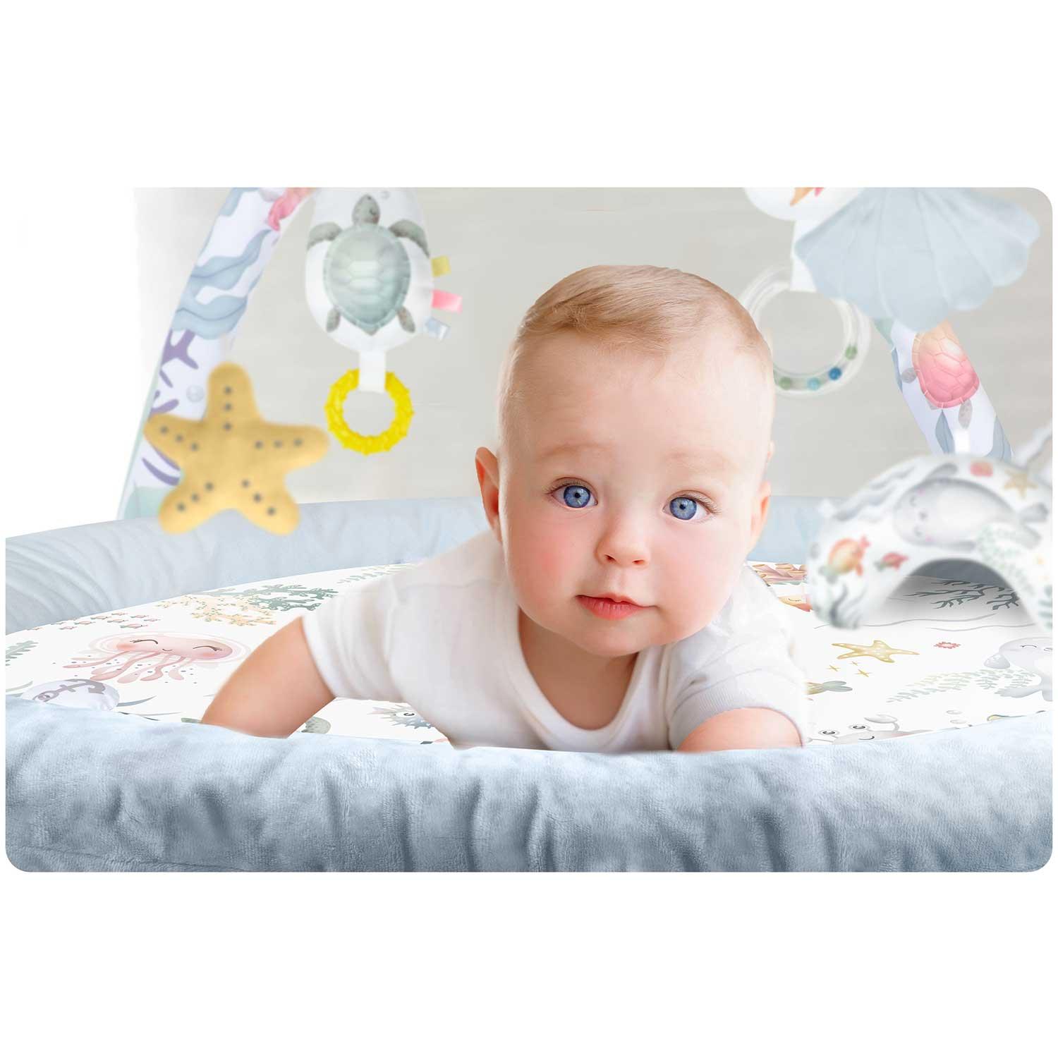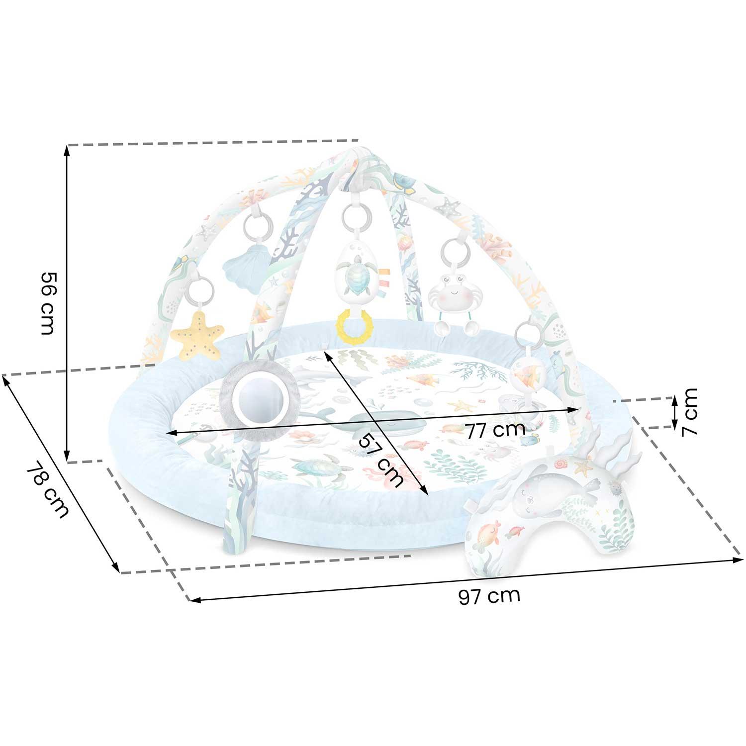 Uključen je i jastuk koji pomaže u jačanju mišića vrata i leđa. Podloga je izrađena od mekih, hipoalergenih materijala koji su ugodni na dodir, lako se čiste i zadovoljavaju stroge europske sigurnosne standarde EN 71. Zahvaljujući laganoj konstrukciji, lako se sklapa i nosi, a atraktivan dizajn s oceanskom tematikom čini je idealnim mjestom za igru i opuštanje – savršen izbor za svaku bebu i praktičan pomagač za roditelje.