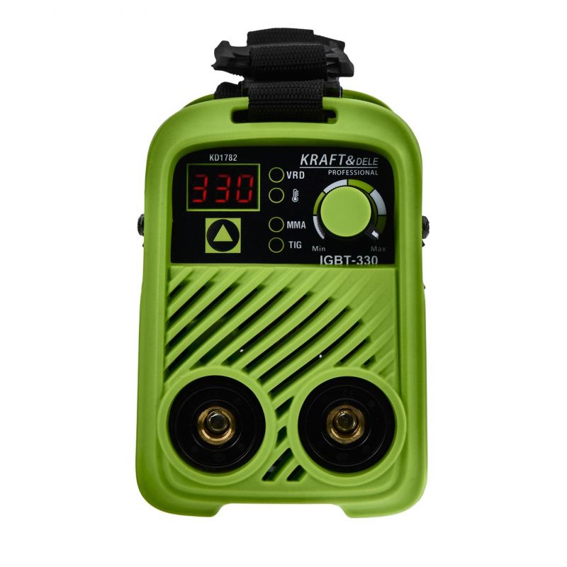 Inverterski aparat za zavarivanje, 330A, MMA TIG LIFT VRD | KD1782 je uređaj dizajniran za elektrolučno zavarivanje obloženom elektrodom. Zavarivanje obloženim elektrodama je metoda elektrolučnog zavarivanja korištenjem potrošne metalne elektrode prekrivene premazom fluksa. Uređaj se koristi za ručno električno zavarivanje elektrodama promjera od 1,6 do 5,0 mm, ovisno o odabranom materijalu i njegovoj debljini. Kontinuirano podešavanje struje zavarivanja omogućuje čak i početnicima optimalno izvođenje zavarivačkih radova.