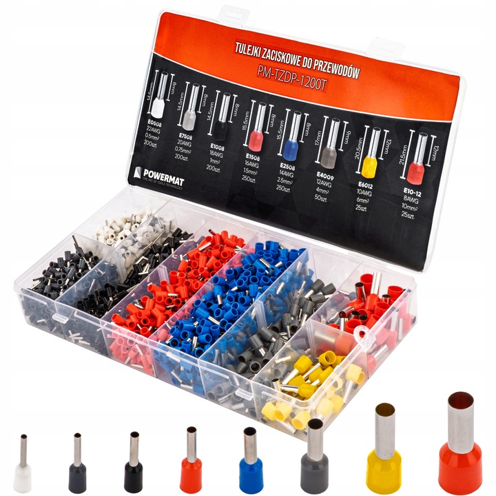 Kabelski terminali, 1200 kom | PM-TZDP-1200T u osam precizno odabranih veličina, što jamči širok raspon primjena u električnim instalacijama. Set je idealan za ugradnju razvodnih ploča, upravljačkih ormara i za precizno završavanje žica u profesionalnim i kućnim instalacijama. Omogućuje precizno završavanje kabela s presjecima od 0,5 mm² do 10 mm². S osam standardiziranih veličina od E0508 do E10-12, možete raditi s tankim upravljačkim kabelima kao i s debljim energetskim kabelima.