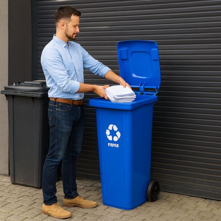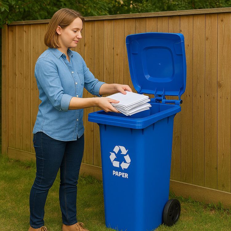 Kanta za papirnati otpad, 120L | plava na kotačima praktično je i mobilno rješenje za prikupljanje i premještanje otpada u domu ili na otvorenom. Izrađena je od izdržljive HDPE plastike, otporna je na UV zračenje, kemikalije i mehanička oštećenja, što je čini prikladnom za sve vremenske uvjete. Čvrsto prianjajući poklopac štiti od vode i neugodnih mirisa, osiguravajući higijensku upotrebu.