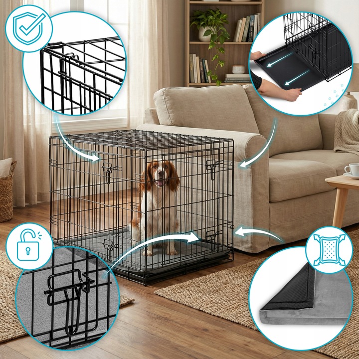 Zahvaljujući metalnoj konstrukciji s čvrstim šipkama, otporan je na oštećenja i osigurava dobru cirkulaciju zraka, što povećava udobnost vašeg psa. Kavez se lako otvara pomoću vrata s bravom, što olakšava rukovanje i pristup životinji, a istovremeno osigurava njezino sigurno držanje bez neželjenog bijega. Kavez ima pouzdan mehanizam za sklapanje i rasklapanje. U nekoliko pokreta pretvara se u ravni, lagani i praktični kofer. Možete ga lako nositi, pohraniti ili ponijeti u automobil.