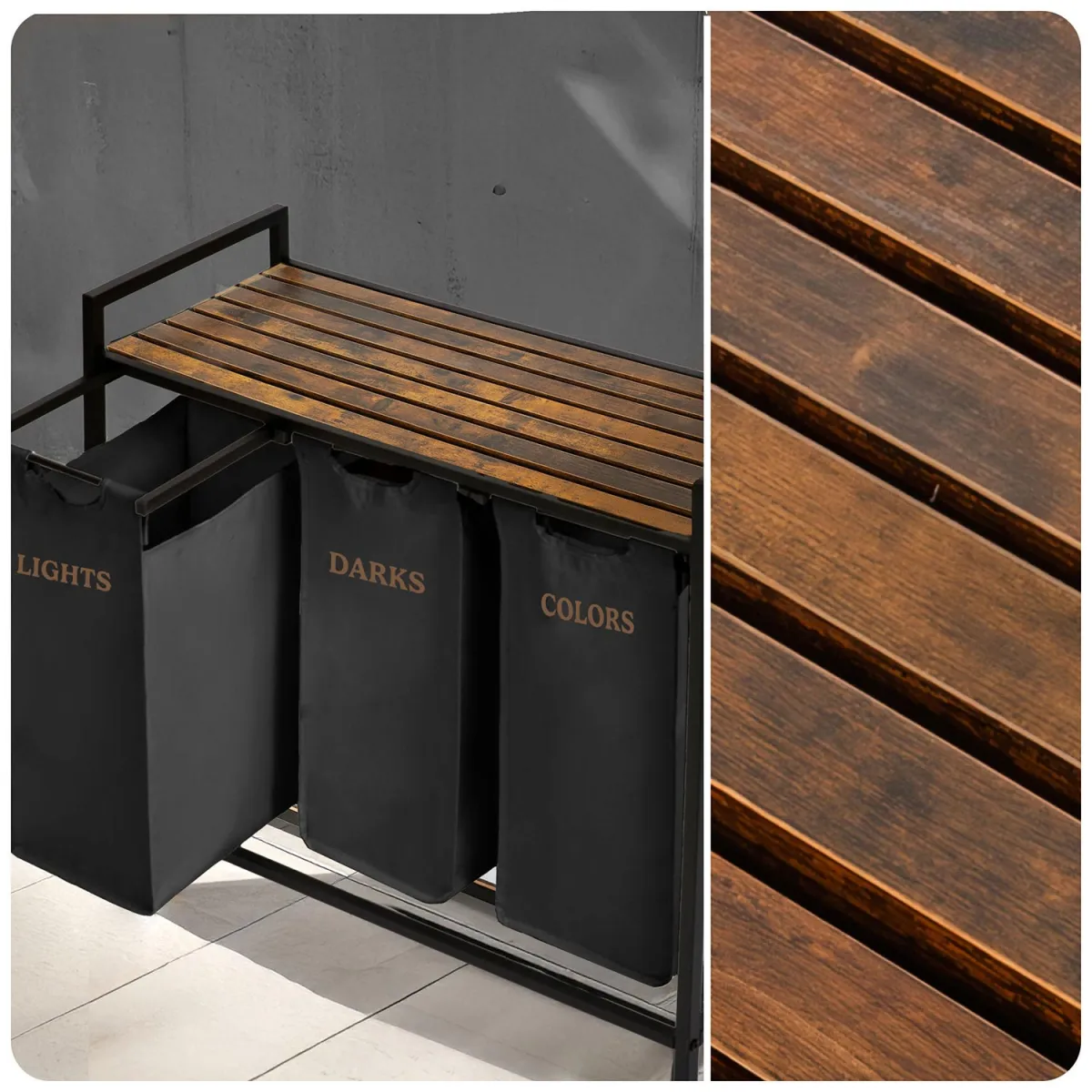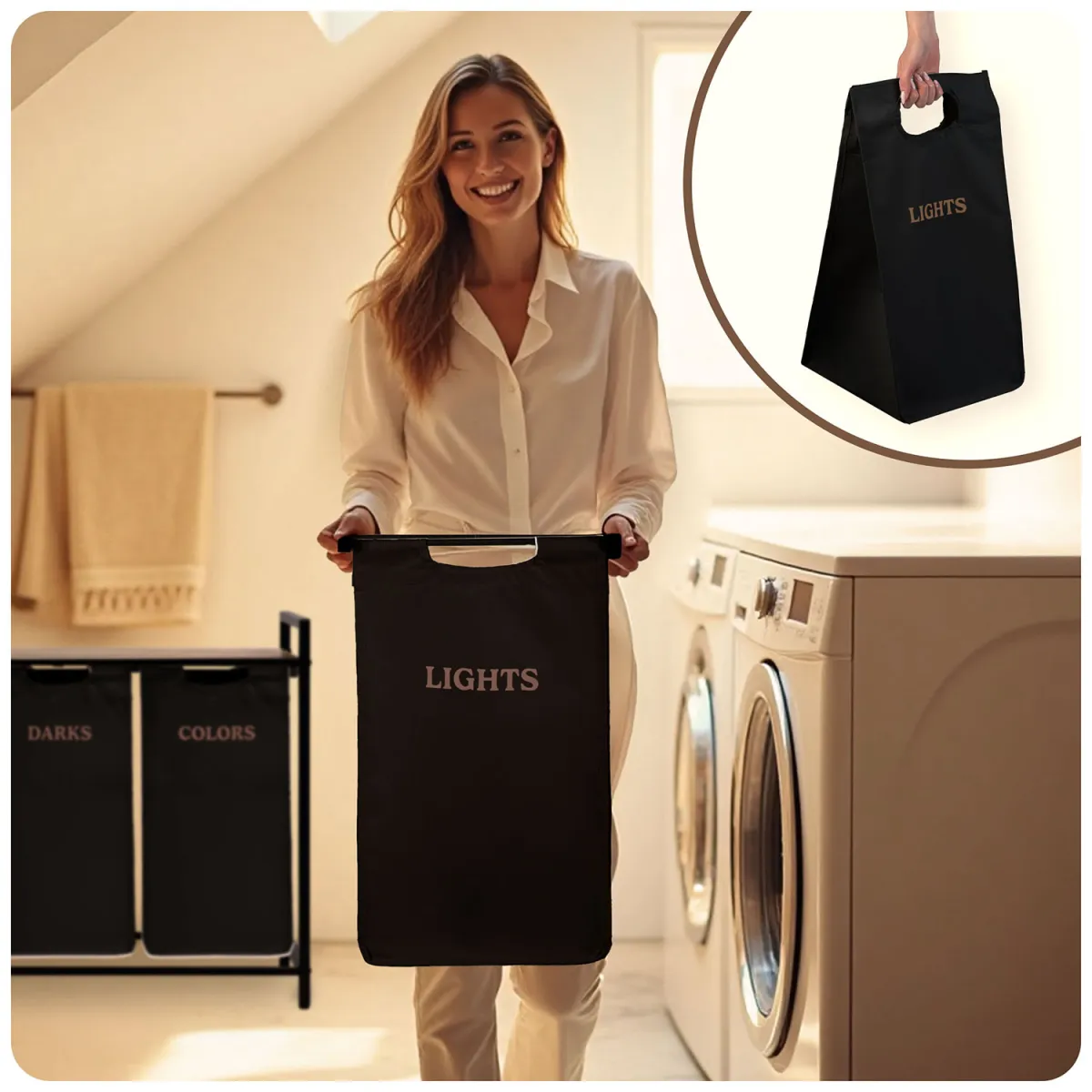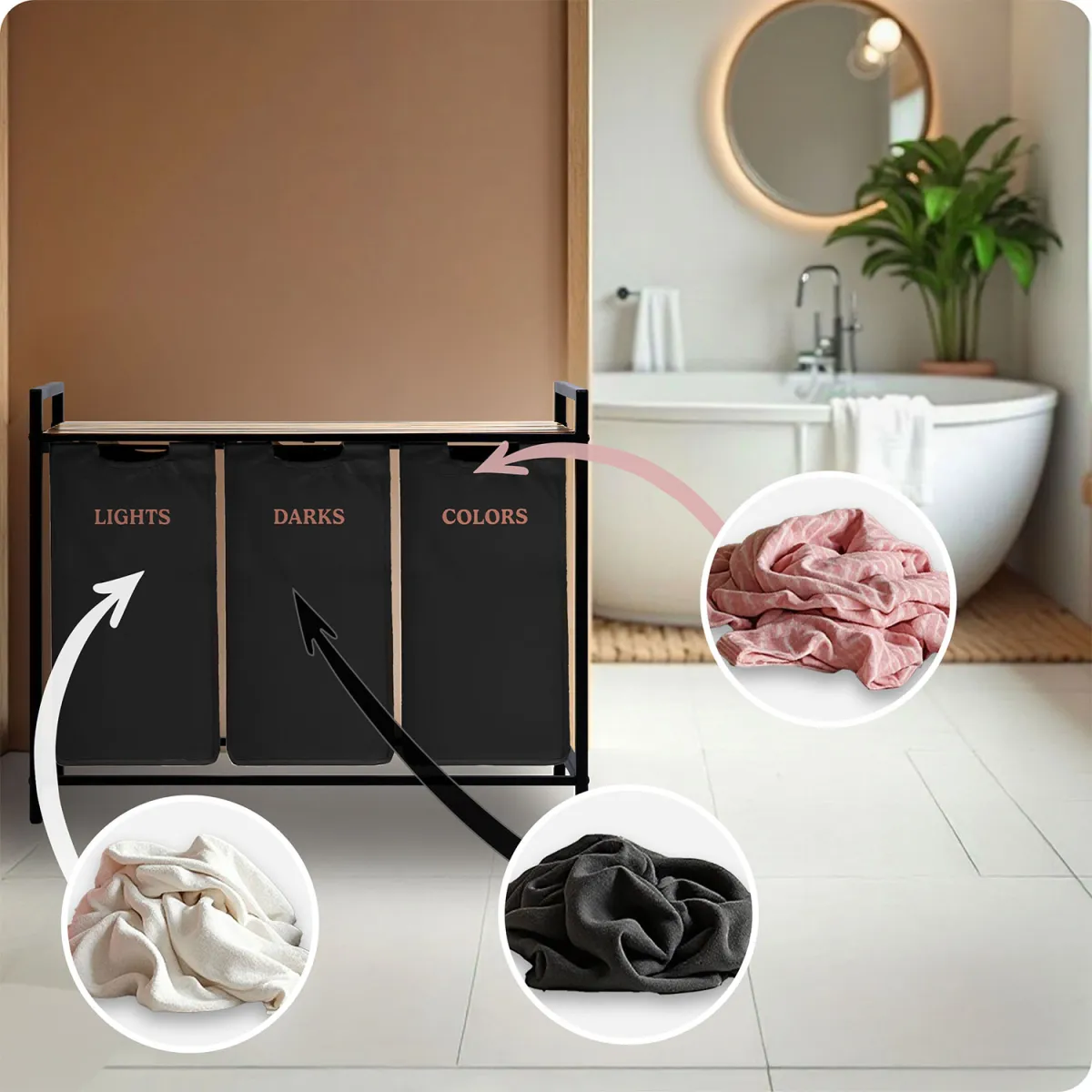 Zahvaljujući ovom sustavu, štedite vrijeme pri pranju i održavate red bez napora. Moderan i minimalistički dizajn s drvenim i crnim elementima uklapa se u većinu interijera – od kupaonice do praonice rublja. Tekstilna vrećica je uklonjiva, jednostavna za održavanje i, po potrebi, možete je jednostavno izvaditi i prenijeti u perilicu rublja. Stabilna metalna konstrukcija osigurava da košara ne gubi oblik čak ni kada je potpuno napunjena.