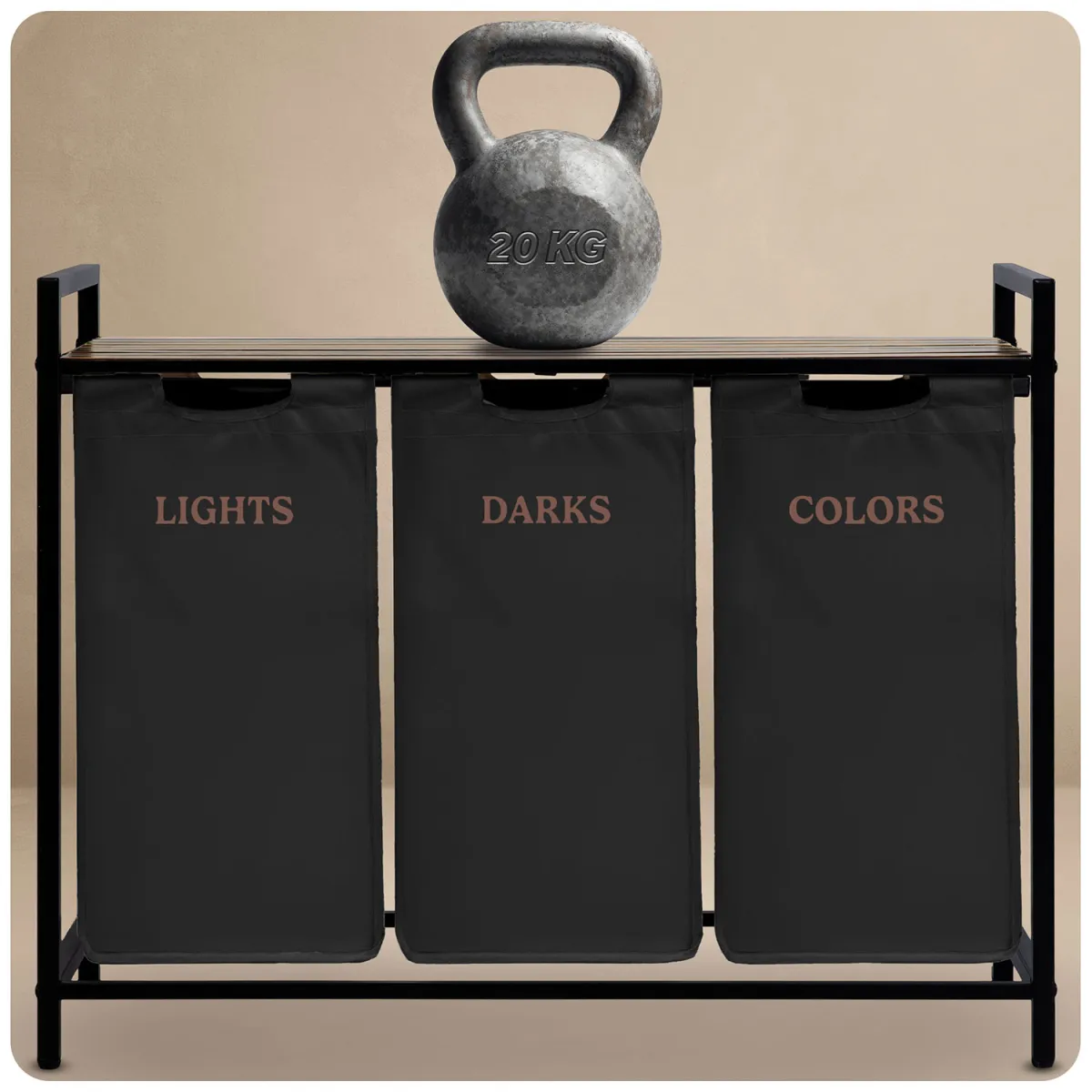 Košara za rublje s tri odjeljka i okvirom, 120L, crna | Massido nudi praktično rješenje za sortiranje rublja u domu u modernom dizajnu. Njena čvrsta konstrukcija kombinira stabilan metalni okvir s laganim, ali izdržljivim tekstilnim umetkom, koji je podijeljen u tri odvojena odjeljka – idealno za sortiranje svijetlog, tamnog i obojenog rublja prilikom punjenja.