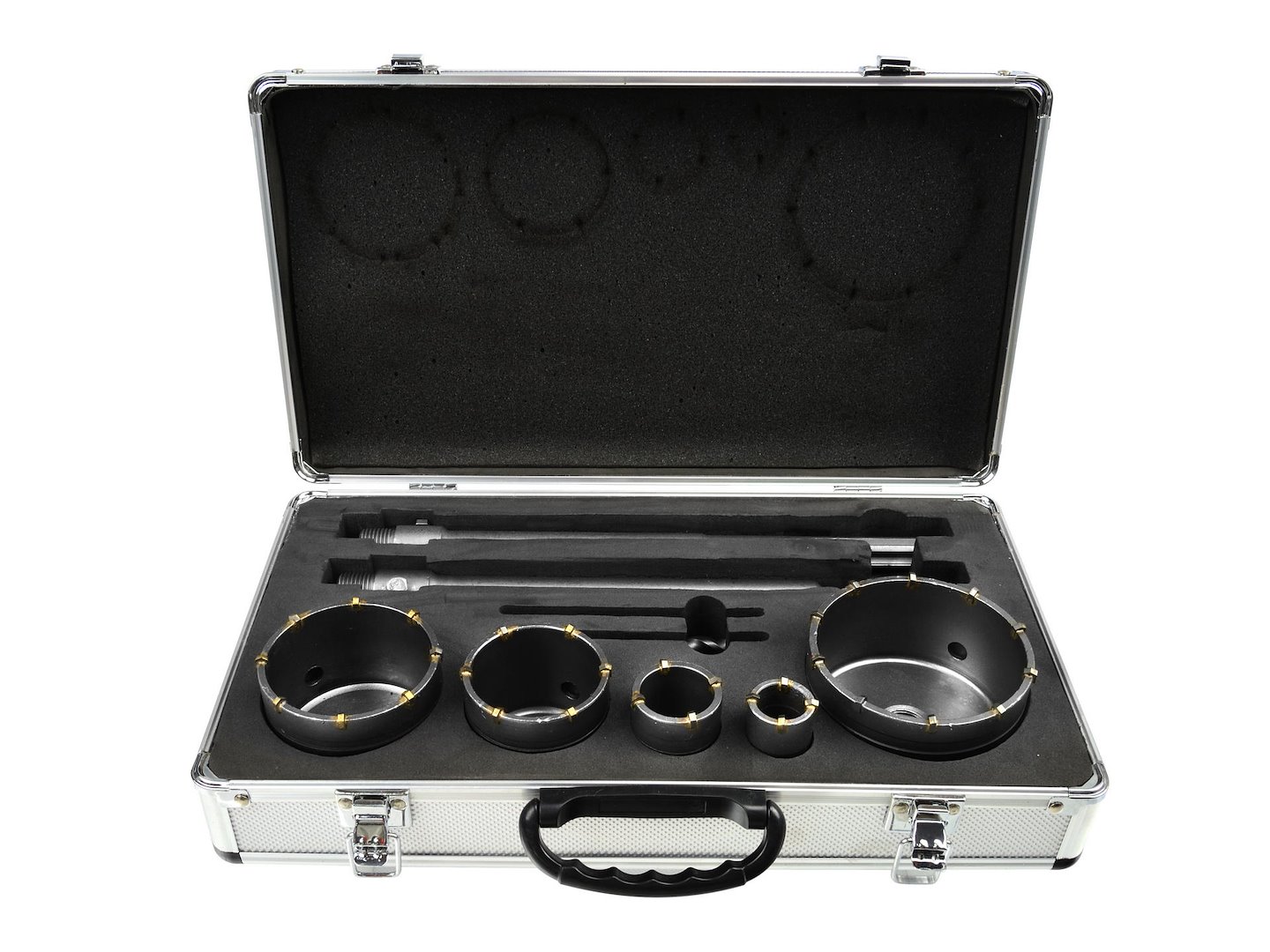 Zahvaljujući tome, ovaj set možete koristiti za širok raspon materijala – od cigle, betona, preko plastičnih zidova do gipsanih ploča ili betonskih ploča – idealno za rezanje rupa za električne kutije, utičnice ili instalacijske vodove. Paket uključuje praktičnu metalnu kutiju koja štiti pojedinačne dijelove tijekom transporta i skladištenja te osigurava da alati ostanu organizirani i pri ruci. Ukupna težina seta je cca. 4.700 kg.