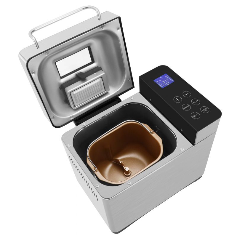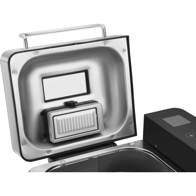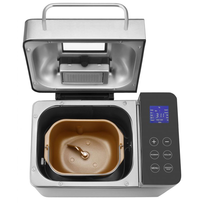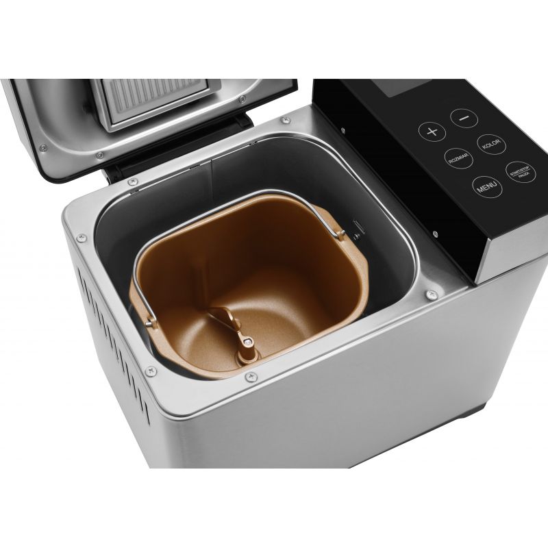 Dostupno je do 19 programa rada, mogućnost odabira boje kore i postavljanja veličine pečenja od 500 g, 750 g ili 1000 g. Još jedna prednost je automatski dozator voća, unutarnja rasvjeta i stakleni prozorčić, zahvaljujući kojem možete kontinuirano pratiti cijeli proces pečenja. Uklonjiva posuda s neprianjajućom površinom olakšava vađenje gotovog proizvoda i čišćenje uređaja. Pećnica ima gumb za funkciju pauze.