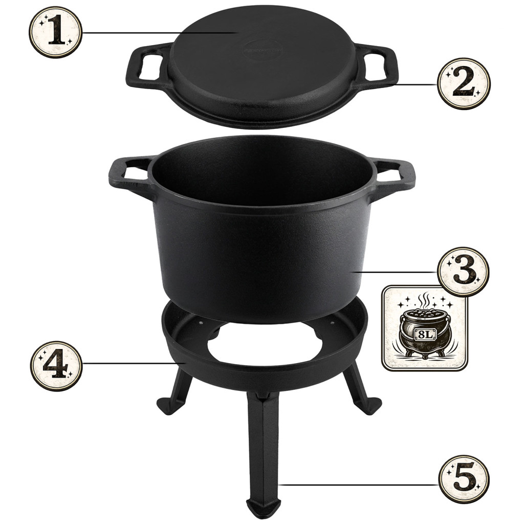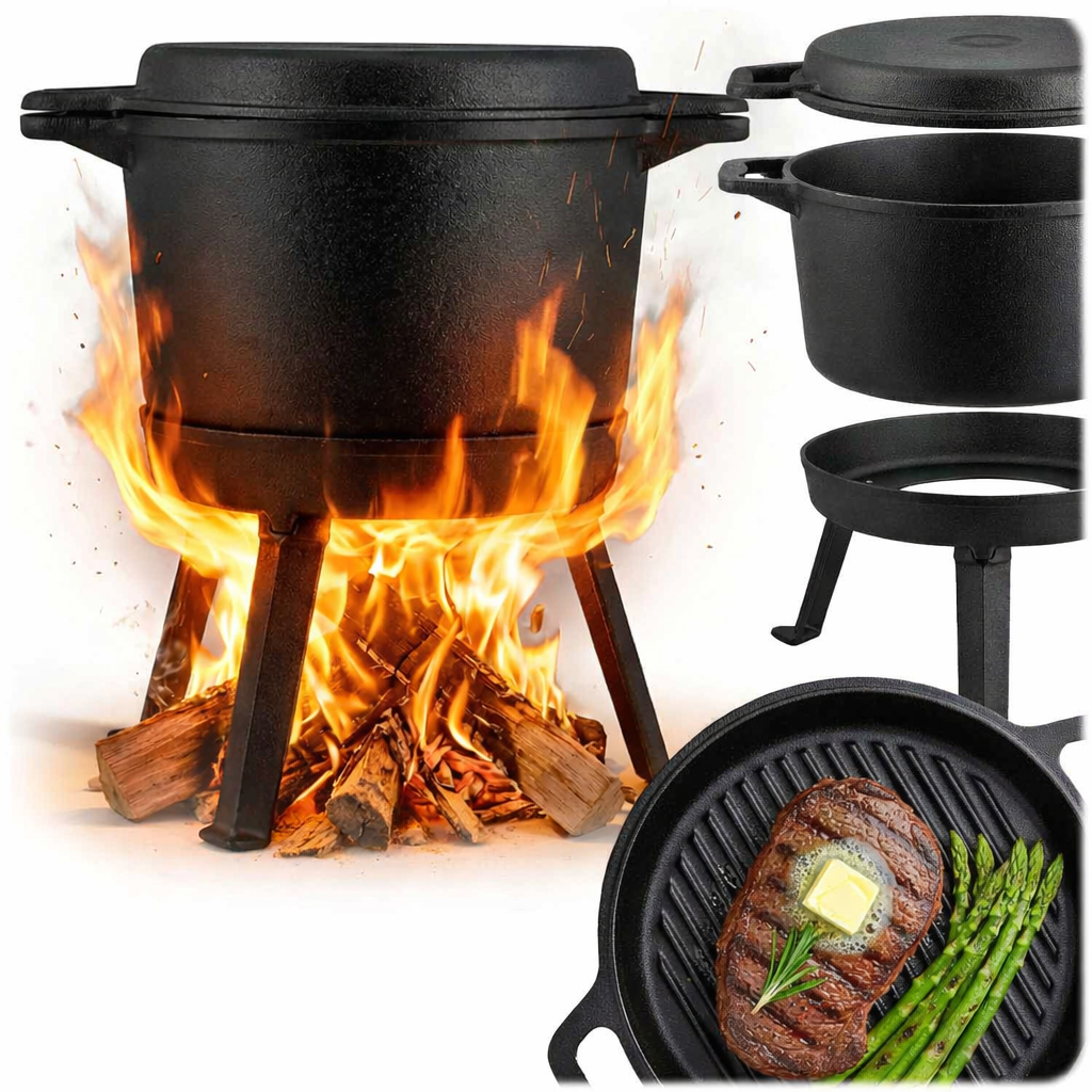 Kuhalo za vodu od lijevanog željeza s tavom 2u1 BD-480, 8L | Berdsen je posuda prikladna za pripremu obroka na otvorenom, idealna za razne oblike kuhanja na vatri i roštilju. Čvrsta konstrukcija od lijevanog željeza osigurava ravnomjernu raspodjelu topline i njezino dugo zadržavanje, što podržava učinkovito kuhanje čak i pri pripremi zahtjevnijih jela. Materijal podnosi visoke temperature i zadržava oblik čak i uz dugotrajnu upotrebu.