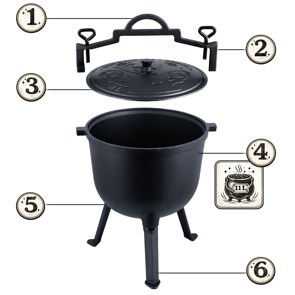 Lijevano željezni kotao, BD-482, 8L | Berdsen je praktična posuda za pripremu obroka na vatri ili roštilju, pogodna za razna kuhanja i druženja na otvorenom. Čvrsta konstrukcija od lijevanog željeza osigurava ravnomjernu raspodjelu topline i dugotrajno zadržavanje topline, zahvaljujući čemu se obroci pripremaju učinkovito i ravnomjerno. Konstrukcija omogućuje korištenje izravno u vatri ili vješanje iznad vatre, dok čvrsti materijali osiguravaju visoku otpornost na temperature i mehanička oštećenja.