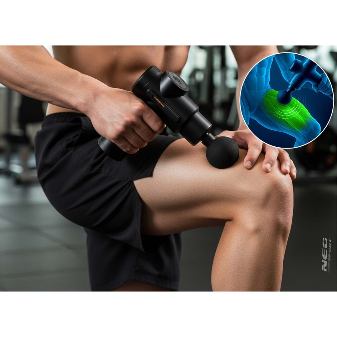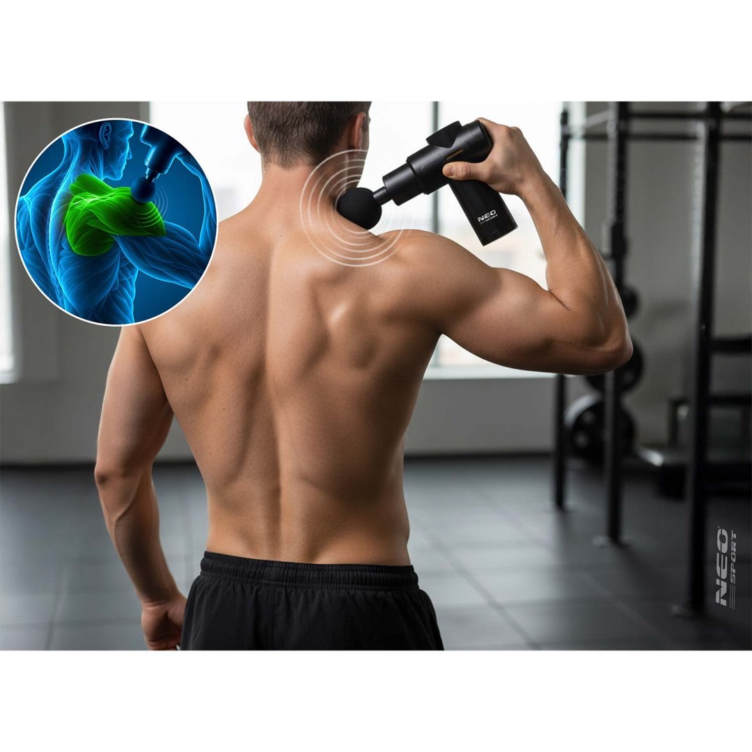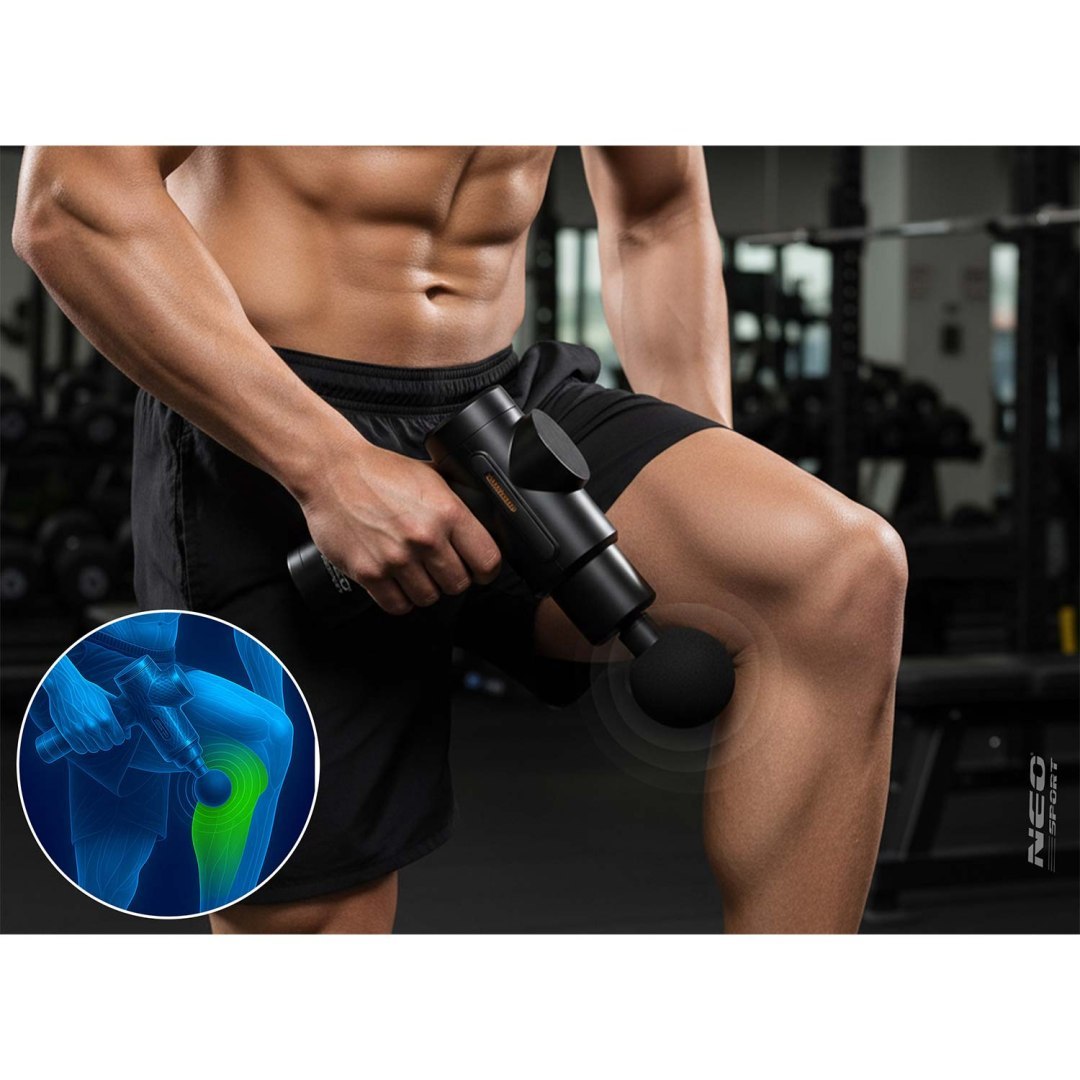 Masažni pištolj NS-504, 6 nastavaka, crni | Neo-sport je snažan uređaj dizajniran za ublažavanje napetosti mišića i regeneraciju tijela kod kuće i u pokretu. Sa 6 izmjenjivih nastavaka možete pokriti različita područja tijela. Od leđa i ramena do nogu ili ruku i prilagoditi masažu specifičnim mišićnim skupinama.