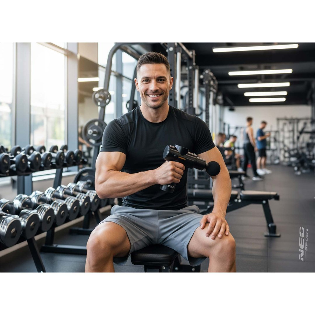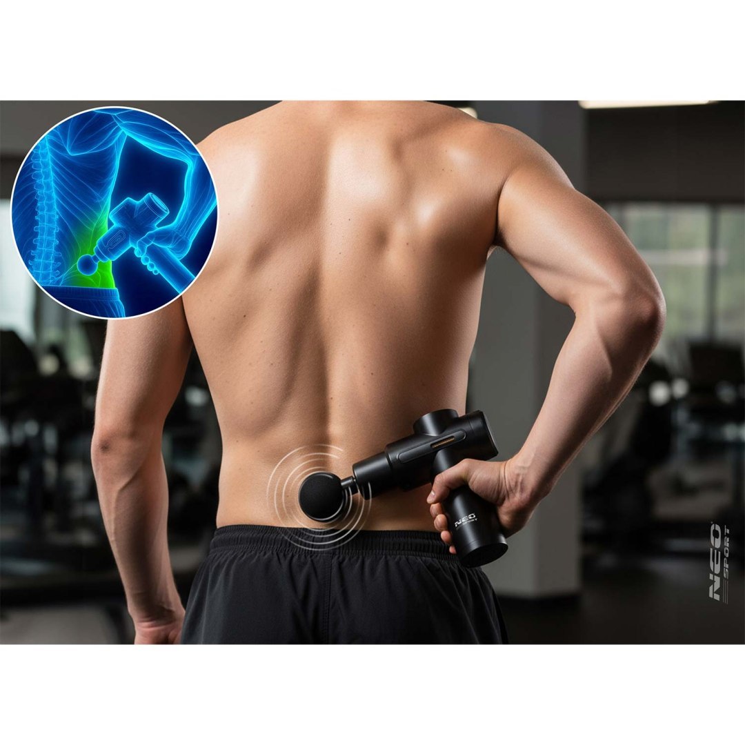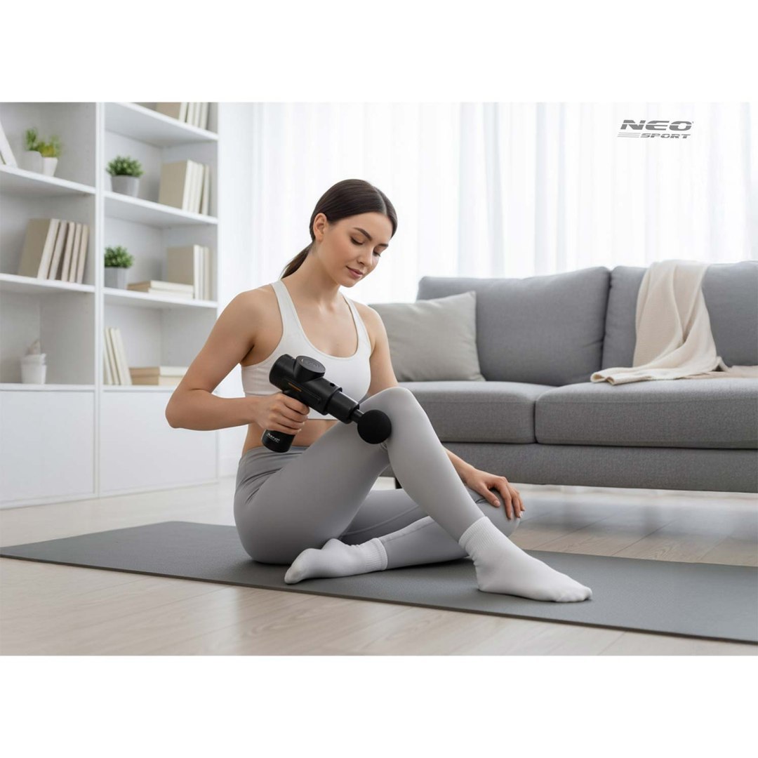 Masažni pištolj NS-504, 6 nastavaka, crni | Neo-sport je snažan uređaj dizajniran za ublažavanje napetosti mišića i regeneraciju tijela kod kuće i u pokretu. Sa 6 izmjenjivih nastavaka možete pokriti različita područja tijela. Od leđa i ramena do nogu ili ruku i prilagoditi masažu specifičnim mišićnim skupinama.