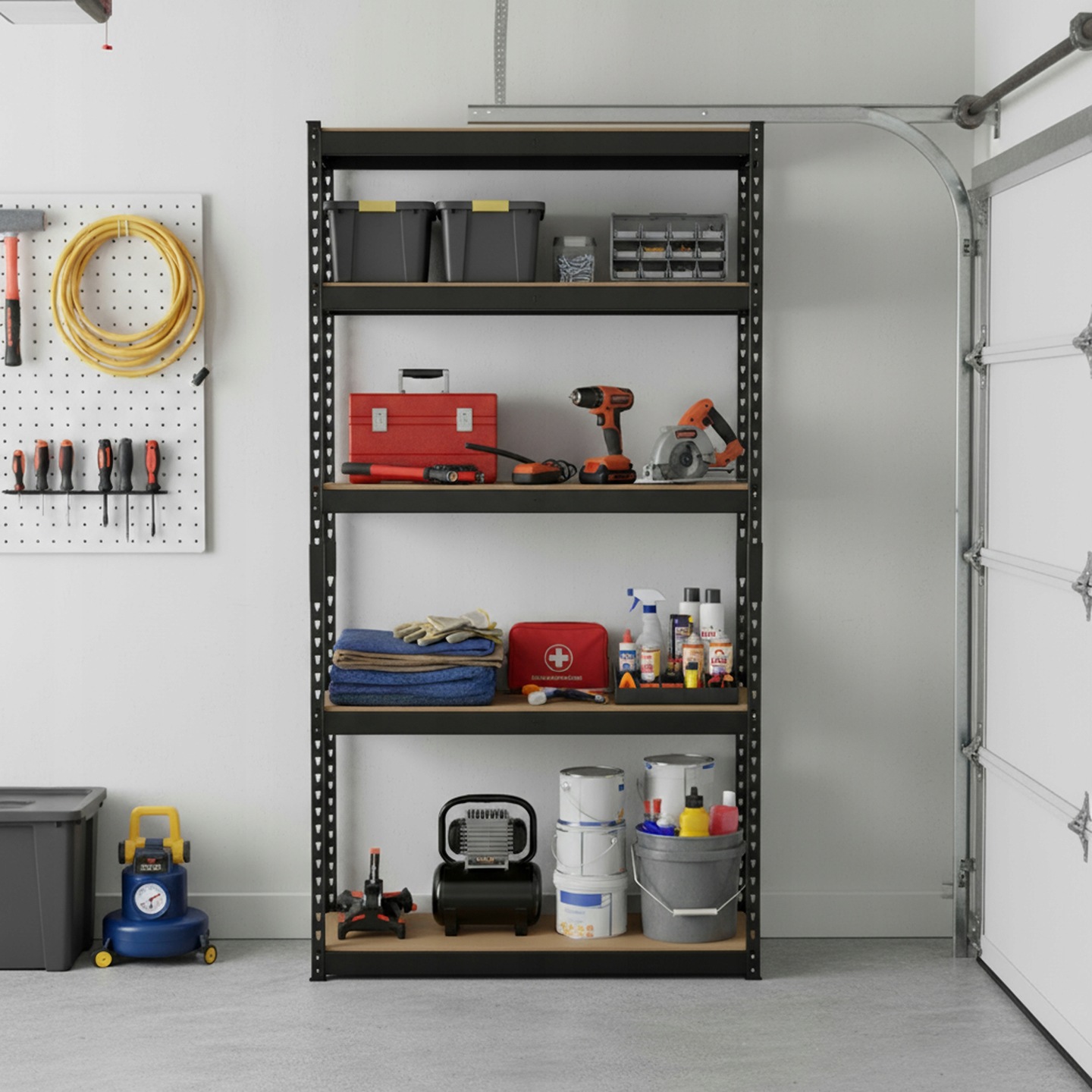 Metalna polica HR-853, 183x90x40cm, crna | Humberg je univerzalna polica prikladna za pohranu stvari u radionici, garaži ili drugom radnom prostoru. Čvrsta metalna konstrukcija osigurava stabilnost i dug vijek trajanja čak i u svakodnevnoj upotrebi, što policu čini prikladnom za radionicu, garažu, skladište ili tehničku prostoriju.