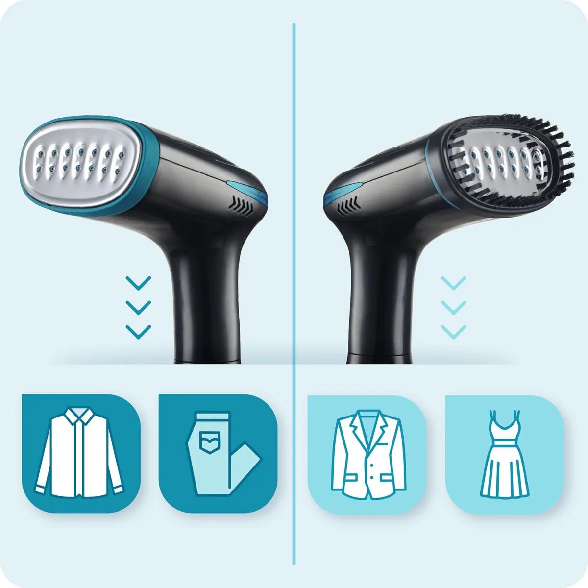 Pakiranje uključuje nastavak s četkom za uklanjanje prašine i vlakana te lijevak za jednostavno ulijevanje vode. Ovo parno glačalo idealno je i za kućnu i za putnu upotrebu, jer njegov kompaktni dizajn i ravnomjerna raspodjela pare jamče profesionalne rezultate, osvježavaju tkanine te uklanjaju bakterije i neugodne mirise.
