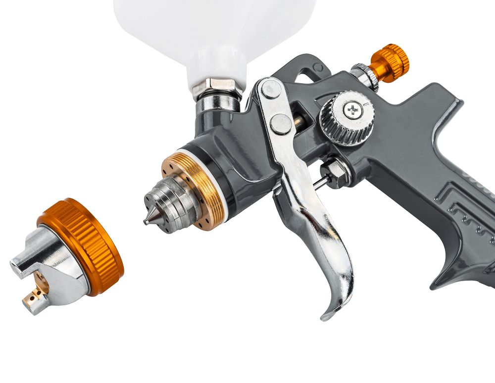 Osim toga, uređaj omogućuje preciznu kontrolu oblika mlaza – okruglog, širokog ili ravnog, prilagođavajući se različitim zadacima bojanja. Gornji spremnik volumena 600 ml osigurava stalnu opskrbu materijalom zahvaljujući gravitacijskom dovodu. Ugrađeni filter hvata prljavštinu i grudice, štiteći mlaznicu od začepljenja i poboljšavajući kvalitetu površine.