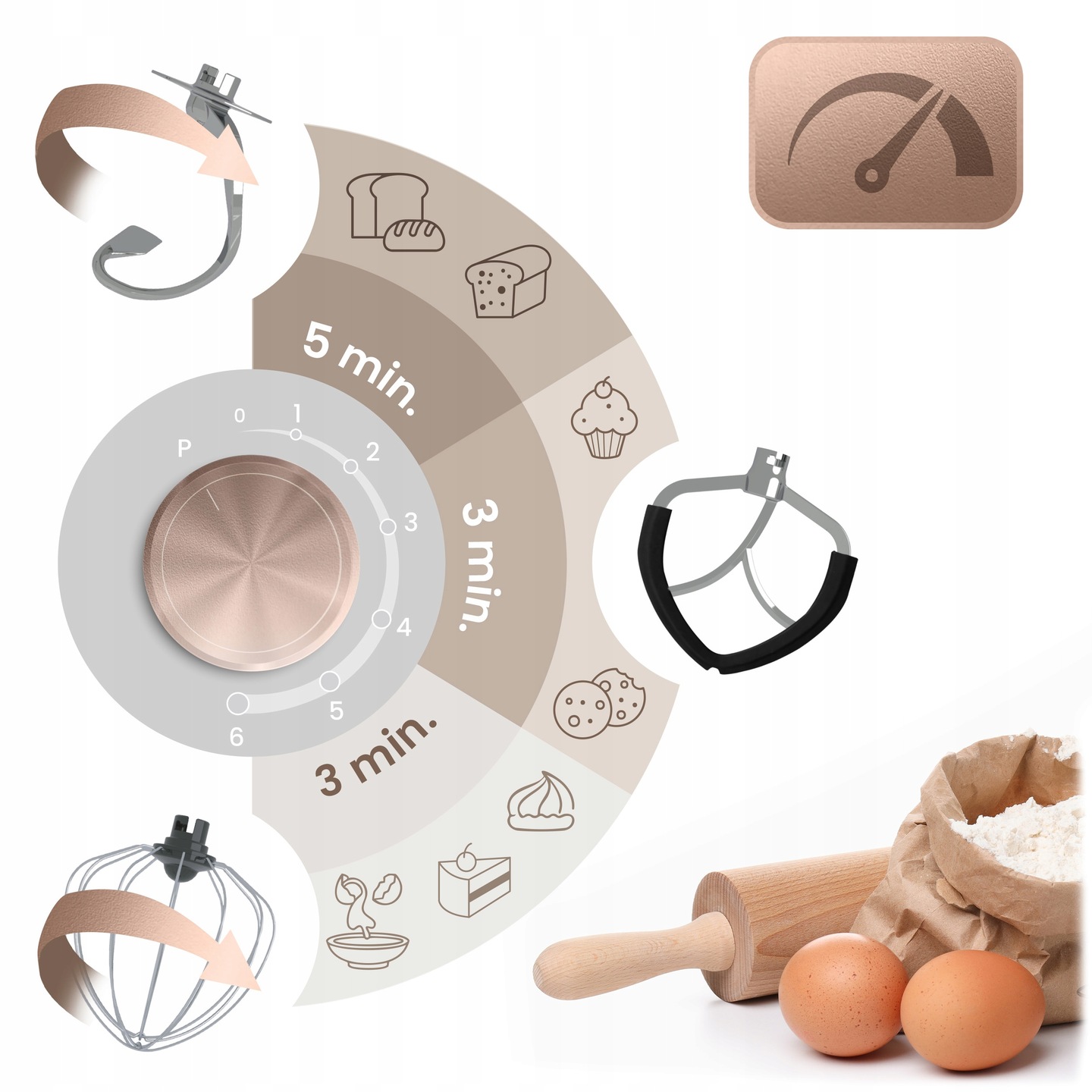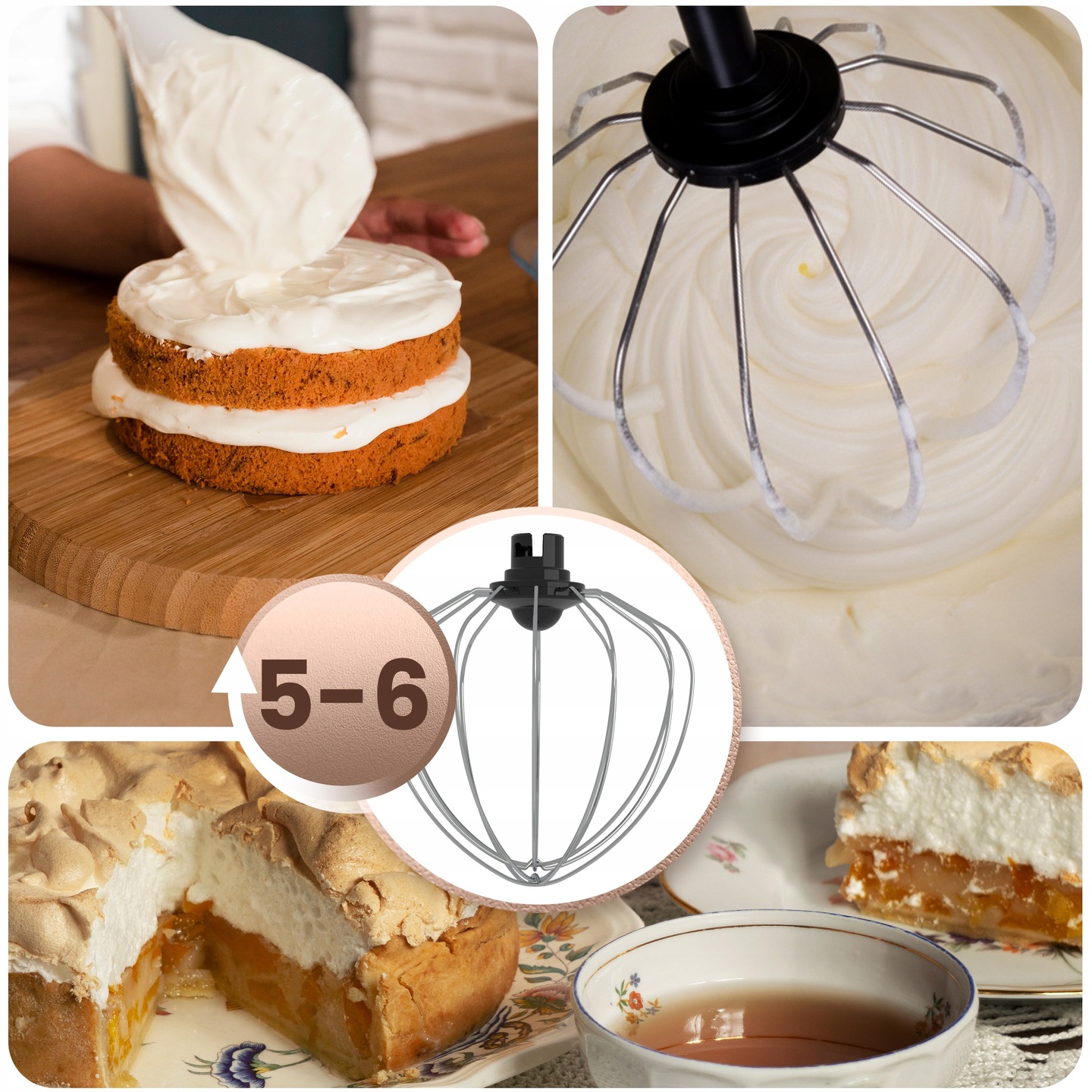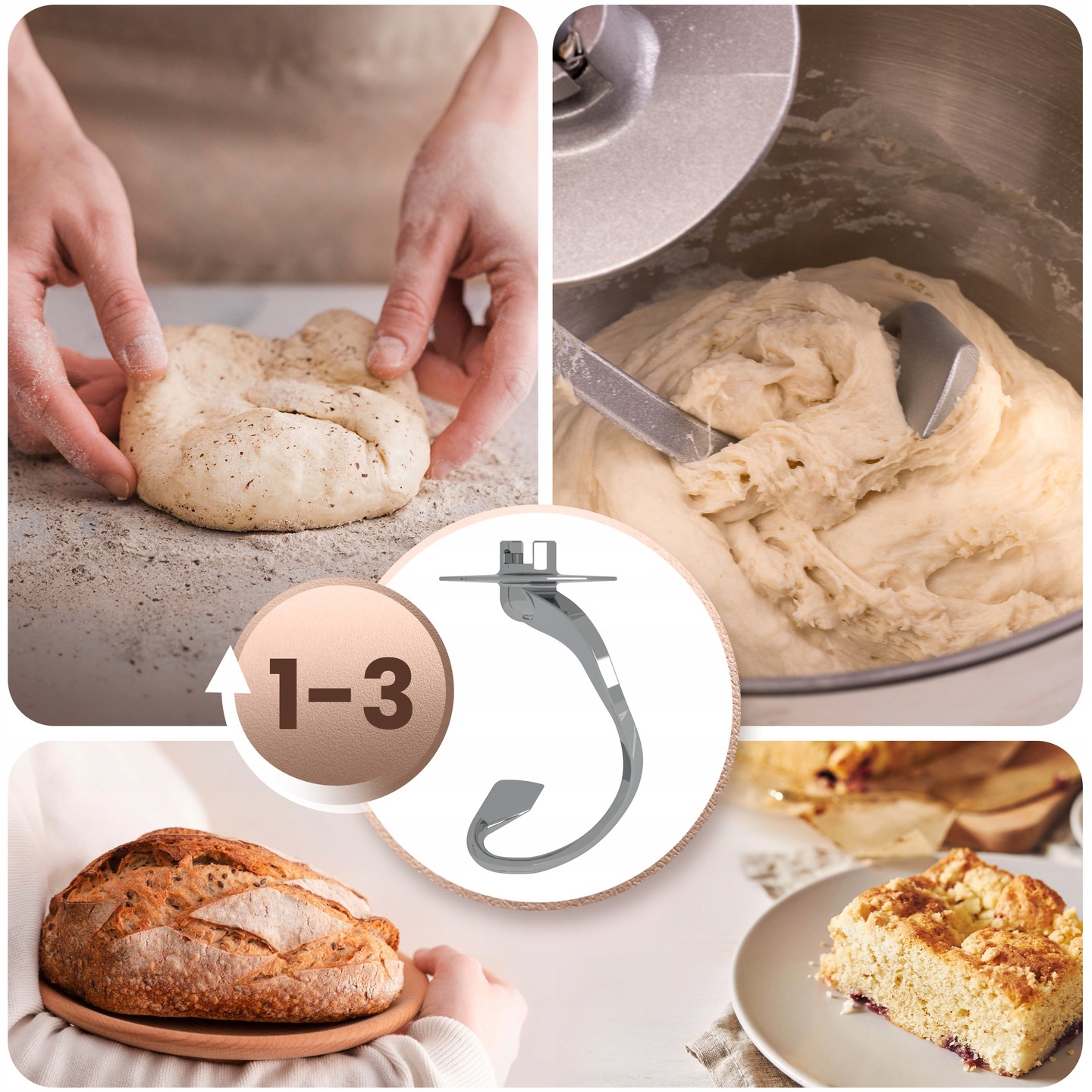 Pakiranje uključuje nekoliko nastavaka (kuka za tijesto, mikser, pjenjača), tako da robot može podnijeti sve, od tijesta za kvasac ili kruh do krema do pahuljastog šlaga. Svaki nastavak ima drugačiju namjenu – idealna brzina, savršen rezultat. Kuka za tijesto najbolje radi na brzinama 1-3, mikser za vrhnje i nadjev najbolje radi na postavkama 2-4, a pjena i šlag pjenjača postižu svoj puni potencijal na brzinama 5-6 – uvijek uz savršenu konzistenciju.