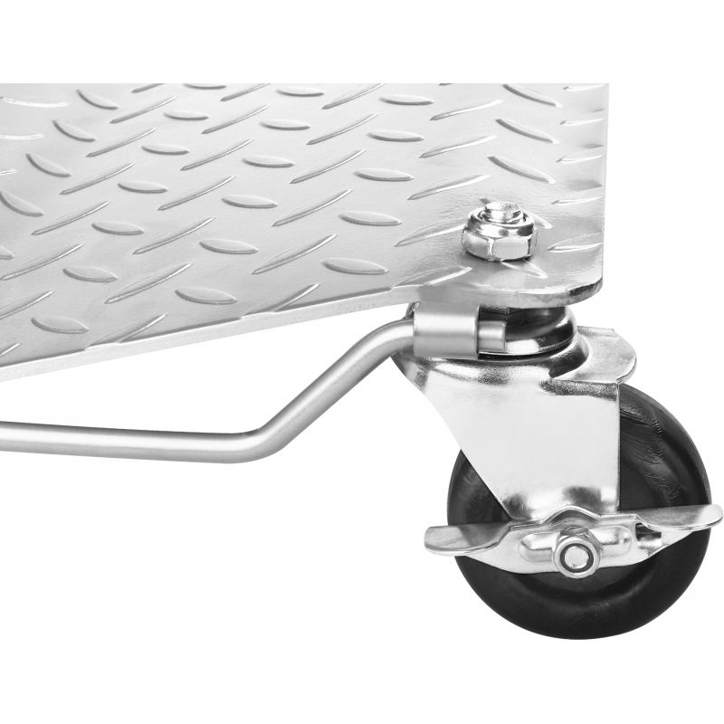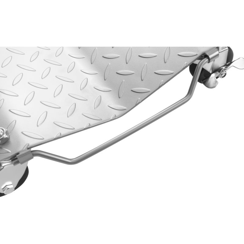 Platforma za transport kolica, 2 kom, 680 kg | KD12681 su čvrste i izdržljive platforme dizajnirane za premještanje teških tereta u radionicama, skladištima i proizvodnim halama. Set uključuje dva dijela za stabilnu potporu i siguran transport velikih i teških predmeta. Svaki valjak može nositi do 680 kg, što omogućuje transport vrlo teških tereta. Oblik vrha smanjuje rizik od klizanja robe i povećava sigurnost rada. Izdržljivi lim s protukliznom površinom poboljšava prianjanje i stabilnost tereta. Kolica imaju 4 okretna kotača, od kojih se dva mogu zaključati, što omogućuje lako manevriranje i stabilno postavljanje. Čvrsta sklopiva ručka sa strane olakšava nošenje i skladištenje.