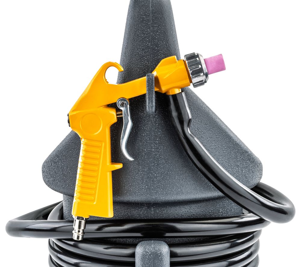 Preporučeni kut od 30–45° i udaljenost od 20–30 cm jamče ujednačenu hrapavost i učinkovito uklanjanje boje. Rezultat je predvidljiv učinak pri pripremi površine za bojanje ili pocinčavanje. Robusni spremnik od 10 litara izrađen je od izdržljivih materijala, a nadopunjen je ručkom za nošenje i pneumatskim priključkom, što osigurava jednostavnu upotrebu i mobilnost.