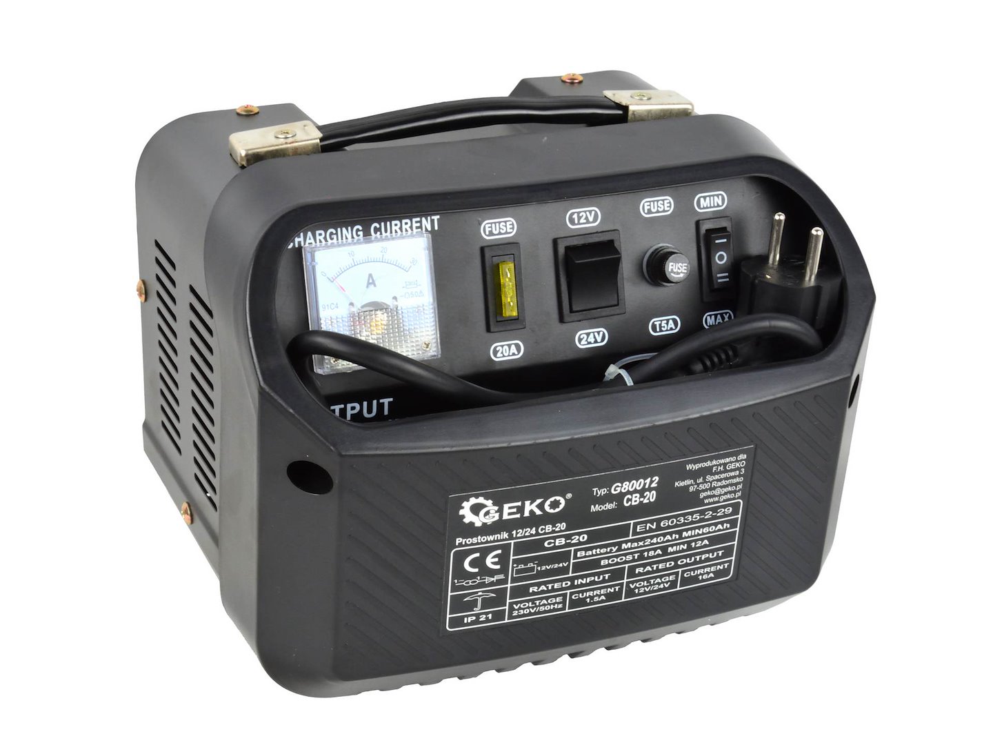 Punjač za automobilske akumulatore, 12/24V, CB-20 | GEKO pruža pouzdanu startnu snagu u automobilima i komercijalnim vozilima. Namijenjen je za punjenje olovnih akumulatora (STD) napona 12 V ili 24 V, koji se koriste u osobnim automobilima, kombijima, kamionima itd. Ima ugrađeni osigurač koji štiti uređaj od pogrešnog polariteta i kratkog spoja.
