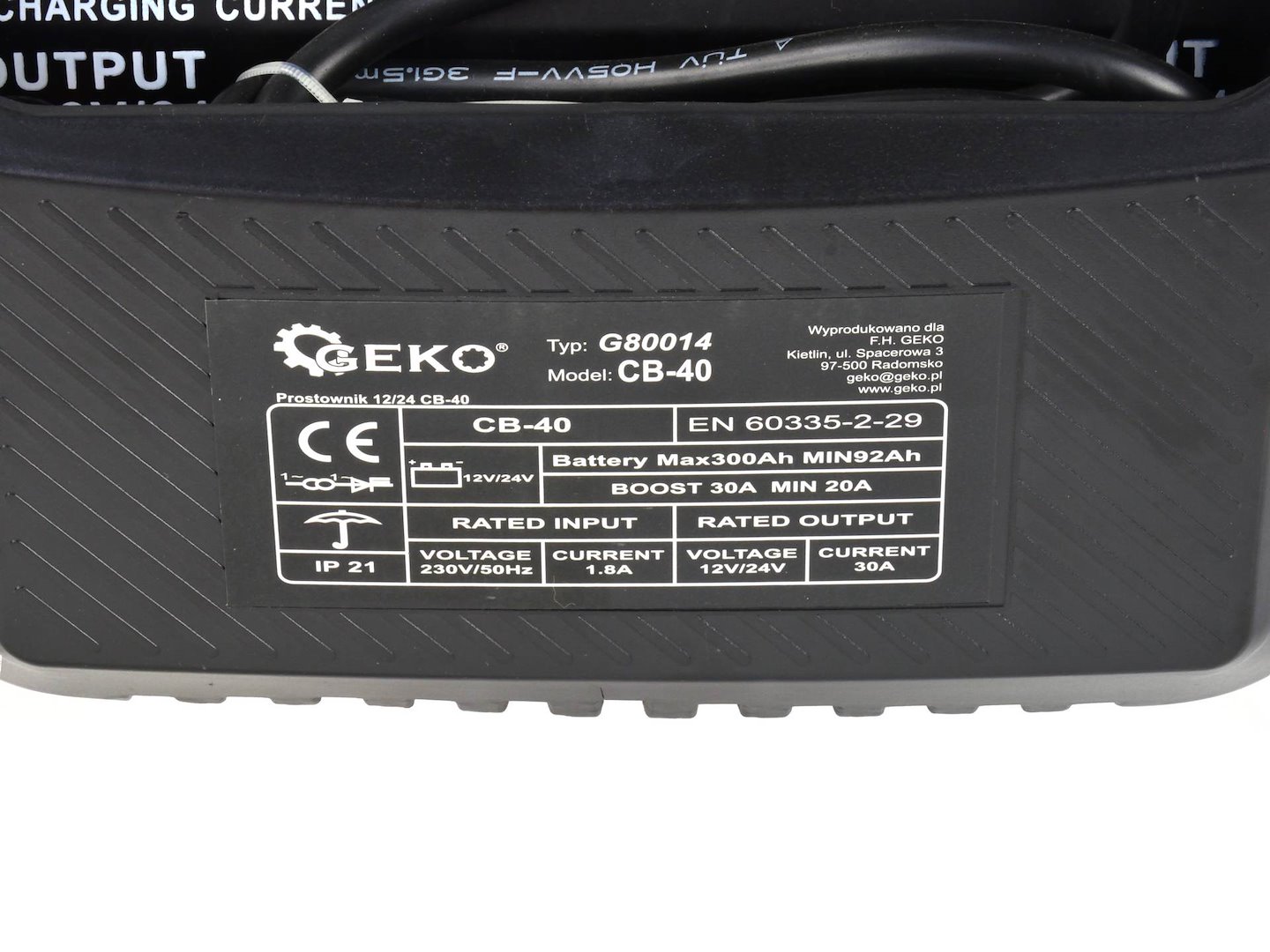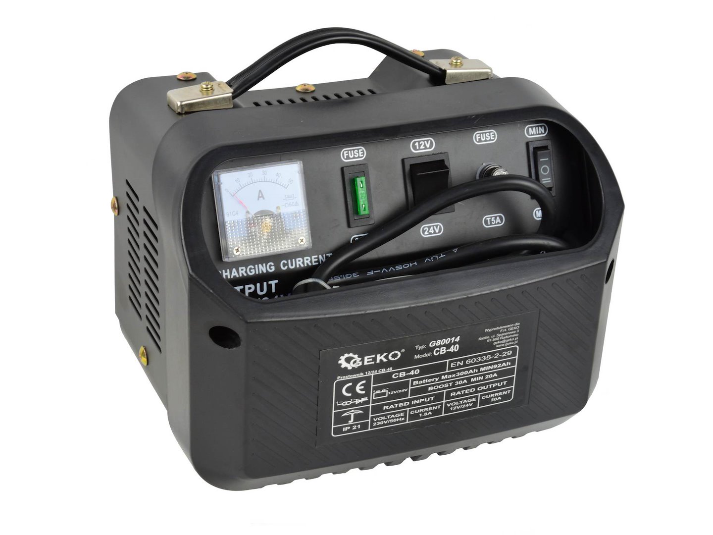 Punjač za automobilske akumulatore, 12/24V, CB-40 | GEKO pruža pouzdanu startnu snagu u automobilima i komercijalnim vozilima. Namijenjen je za punjenje olovnih akumulatora (STD) napona 12 V ili 24 V, koji se koriste u osobnim automobilima, kombijima, kamionima itd. Ima ugrađeni osigurač koji štiti uređaj od pogrešnog polariteta i kratkog spoja.
