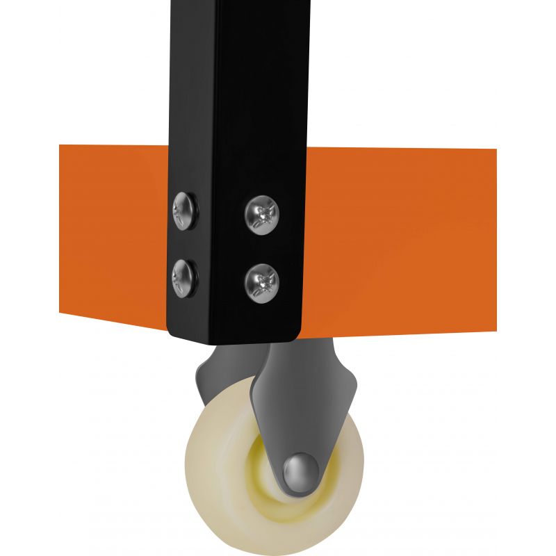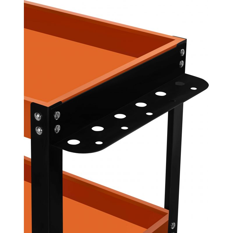 Stabilna čelična konstrukcija osigurava izdržljivost i nosivost, dok četiri transportna kotača omogućuju glatko pomicanje kolica po raznim površinama. Još jedna prednost je ergonomska transportna ručka i bočna šina s rupama koja omogućuje vješanje alata. Kompaktan dizajn i promišljen raspored elemenata čine kolica ugodnima za korištenje i omogućuju vam održavanje reda na radnom mjestu.