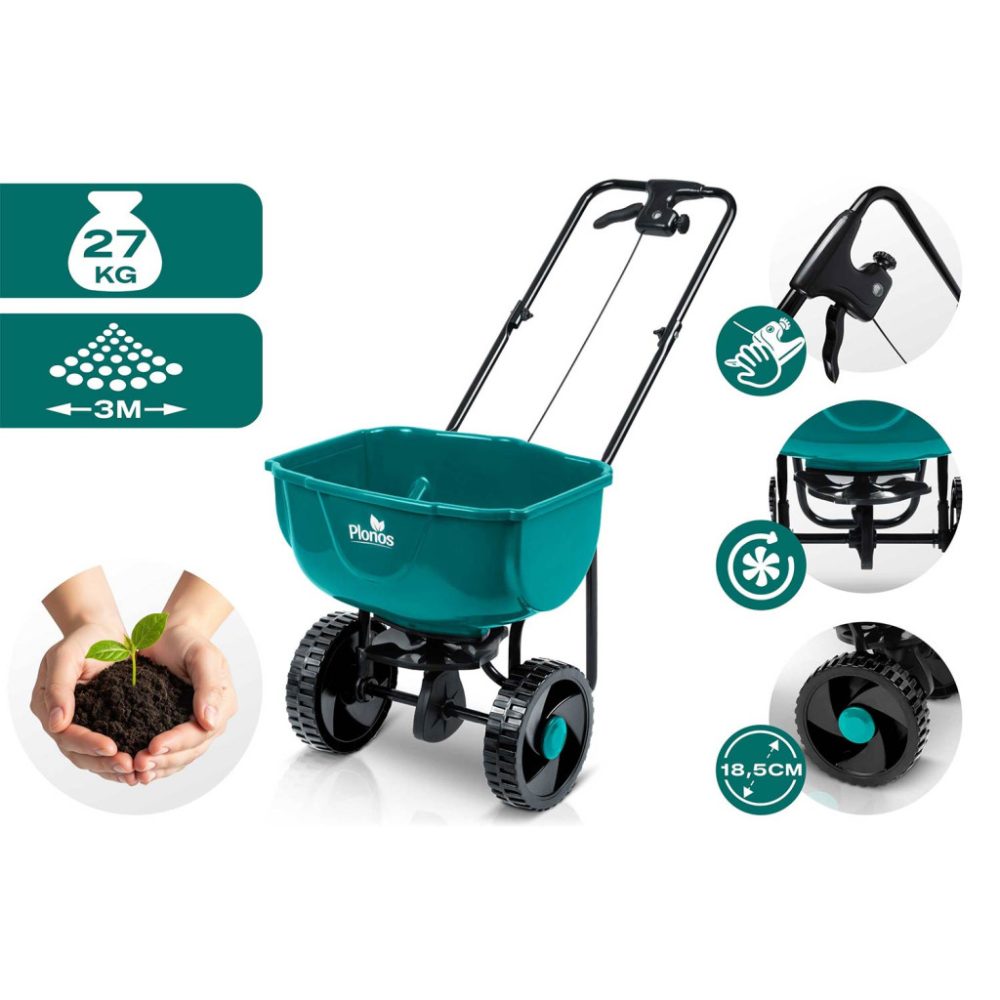 Ručna sijačica PL-981, 27L | Plonos je praktičan pomagač za ujednačenu sjetvu sjemena, gnojidbu i cjelogodišnju upotrebu u vrtu. Omogućuje precizno doziranje zahvaljujući podesivoj sjetvi i širini rasipanja do 3 m, što značajno ubrzava rad na velikim površinama. Integrirani sustav omogućuje jednostavnu kontrolu širine rasipanja i precizno doziranje sjemena, gnojiva ili soli. Osigurava ujednačenu primjenu, štedi vrijeme i materijal.