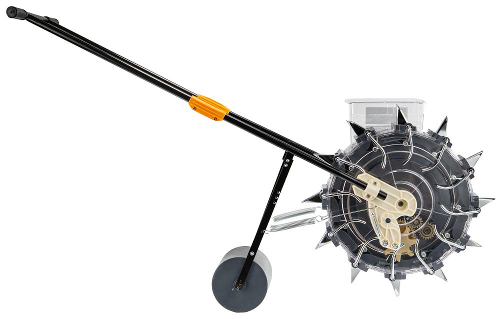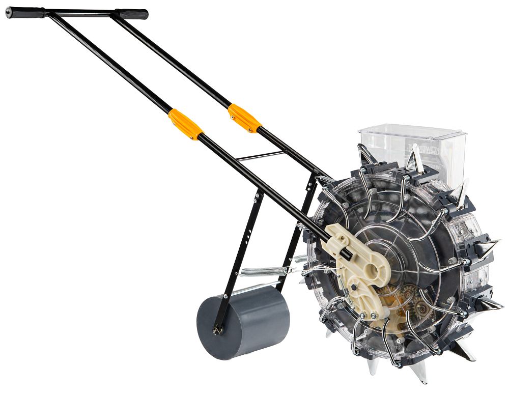 Dizajn osigurava stabilno vođenje stroja po tlu, što se odražava u ujednačenoj sjetvi. Pritisni valjak odgovoran je za zbijanje tla nakon sjetve, zahvaljujući čemu sjeme ima bolji kontakt sa supstratom i ujednačene uvjete za klijanje. Volumen od 3,7 kg omogućuje dulji rad bez čestog dopunjavanja sjemena, što stvarno ubrzava cijeli proces sjetve. Prozirni spremnik daje vam potpunu kontrolu nad razinom, tako da ne prekidate rad u neočekivanom trenutku.