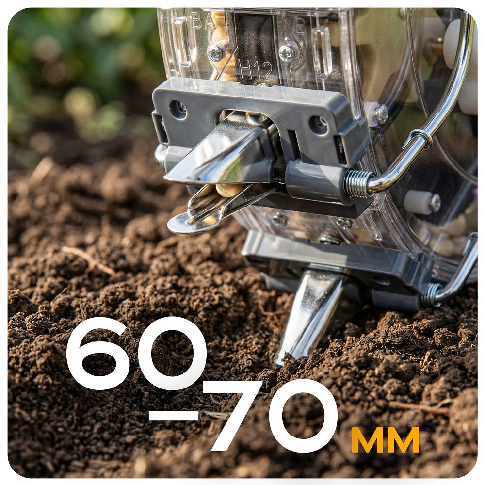Podešavate dubinu i razmak, tako da možete prilagoditi sjetvu kukuruzu, grahu, grašku ili soji. Dobivate univerzalni alat za različite kulture bez potrebe za promjenom uređaja. Sijačica sije 1-2 sjemena na istom razmaku, zahvaljujući čemu biljke imaju optimalne uvjete za rast. Postići ćete manji gubitak materijala i predvidljivije rezultate bez potrebe za ispravljanjem redova. Opcija podešavanja dubine od 60–70 mm omogućuje prilagodbu sjetve vrsti tla i sjemena.