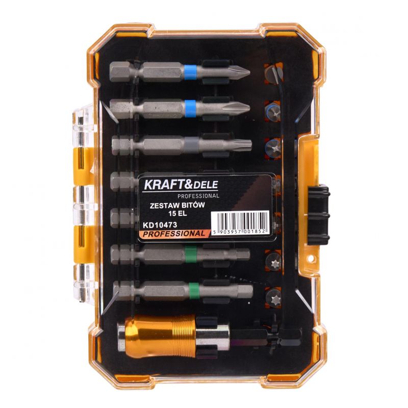 Set bitova, 15 dijelova | KD10473 sadrži različite vrste nastavaka za odvrtanje, prikladne za kućnu i profesionalnu upotrebu. Zahvaljujući svojoj izdržljivosti, pouzdanosti, preciznosti, visokokvalitetnim materijalima, modernim dizajnerskim rješenjima i drugim prednostima, sigurno će zadovoljiti i najzahtjevnije korisnike. Set se isporučuje u praktičnom pakiranju koje omogućuje brz pregled dostupnog alata.