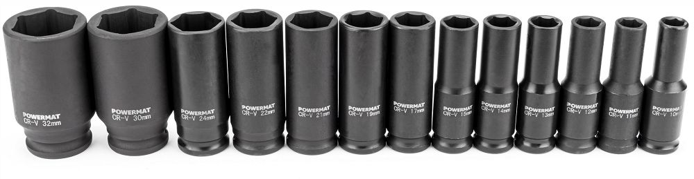 Set nasadnih ključeva, 10-32, 1/2′ | PM-ZNU-13-0.5T sadrži 13 udarnih nasadnih ključeva, dizajniranih za preciznu upotrebu u automehaničarskim radionicama ili radionicama. Veličine glava su od 10 do 32 mm sa standardnim pogonom od 1/2′. Izrađeni su od izdržljivog CR-V čelika s precizno obrađenim unutarnjim steznim otvorom prema standardima, opremljeni su čitljivim oznakama veličine i pohranjeni su u praktičnoj kutiji, što ih čini idealnim za upotrebu u automehaničarskim radionicama, vulkanizerskim radionicama i općim radionicama.