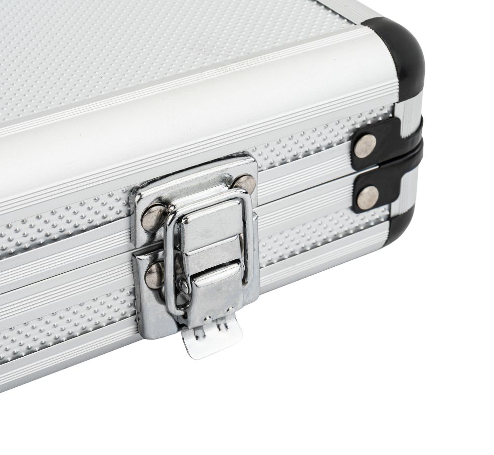 Cijeli set pohranjen je u praktičnoj torbici za nošenje. Svaki predmet ima svoje mjesto, što olakšava organizaciju. Dobivate red, sigurno skladištenje i praktičan transport za svaki posao. Kutija je opremljena bravom za osiguranje sadržaja tijekom transporta i skladištenja. To jamči da se alat neće otvoriti ili proliti tijekom transporta. Dobivate mir, red i sigurnost da je cijeli set sigurno zatvoren.