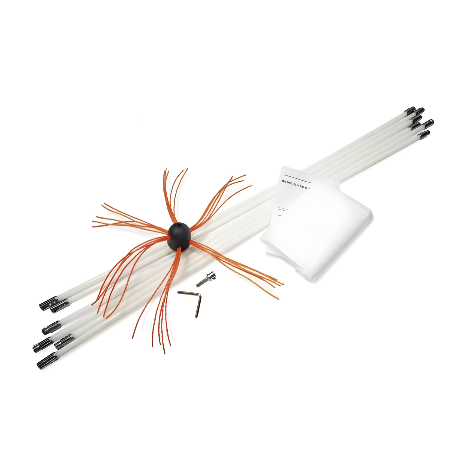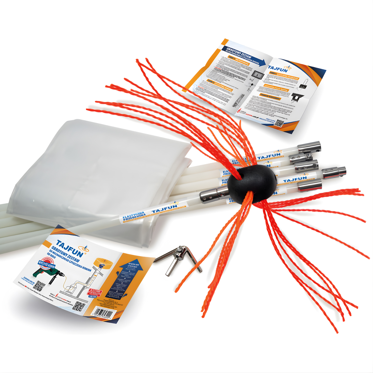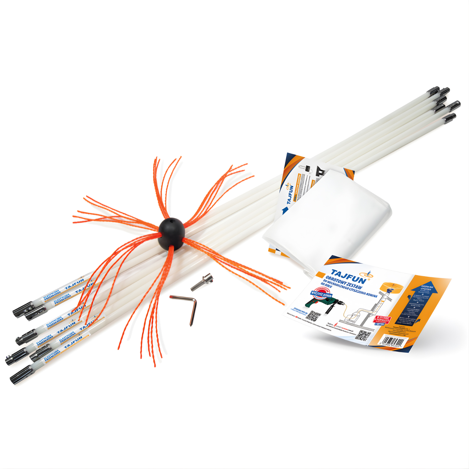 Set za čišćenje dimnjaka, 6 m | TAJFUN omogućuje vam brzo i jednostavno čišćenje dimnjačkih cijevi u udobnosti vašeg doma. Omogućuje vam uklanjanje naslaga čađe i kreozota iz dimnjaka od opeke, keramike i metala, održavajući cijevi dimnjaka potpuno čistima. Ovaj set kombinira jednostavnost korištenja s maksimalnom učinkovitošću i, zahvaljujući fleksibilnim nastavcima, doseže svaki kut dimnjaka.