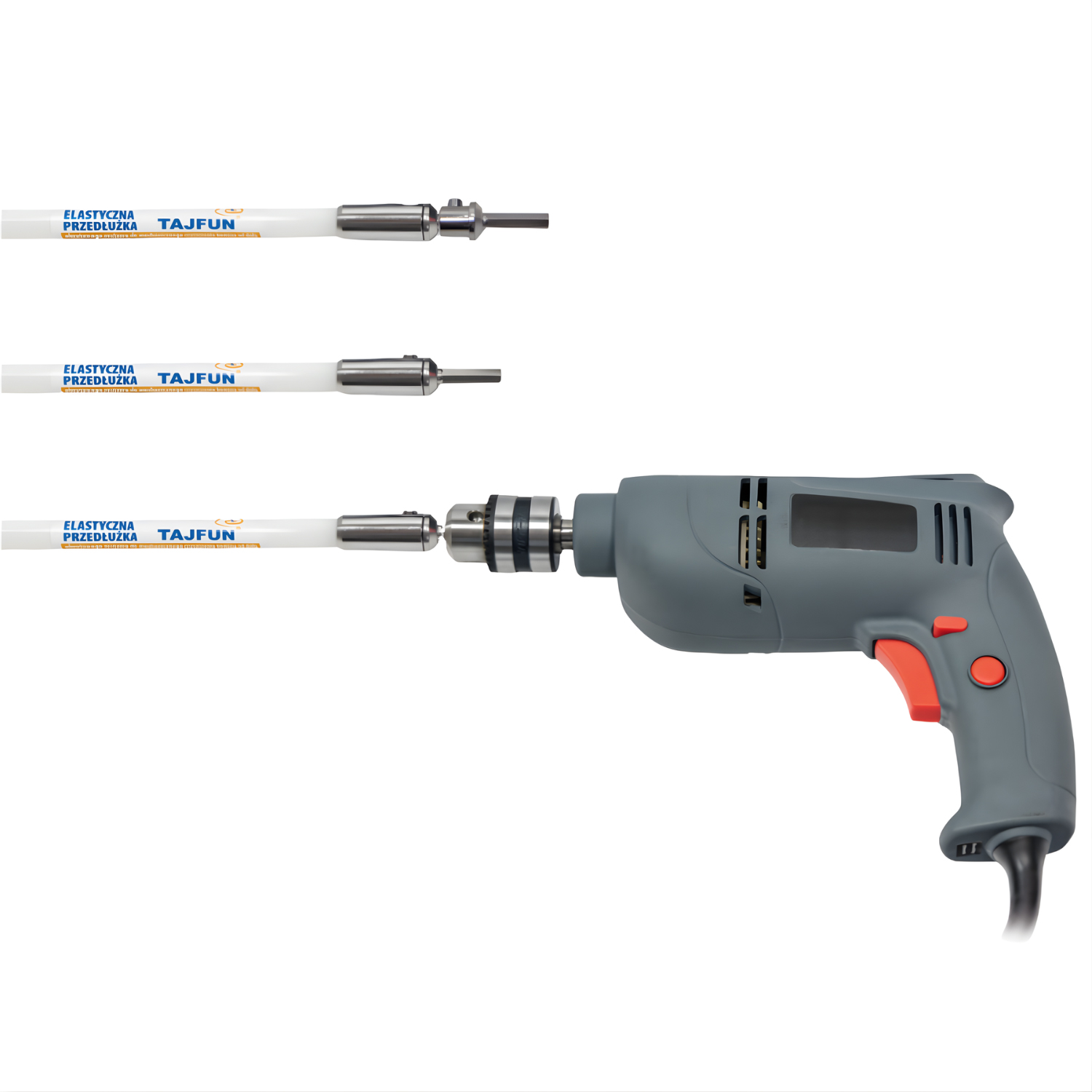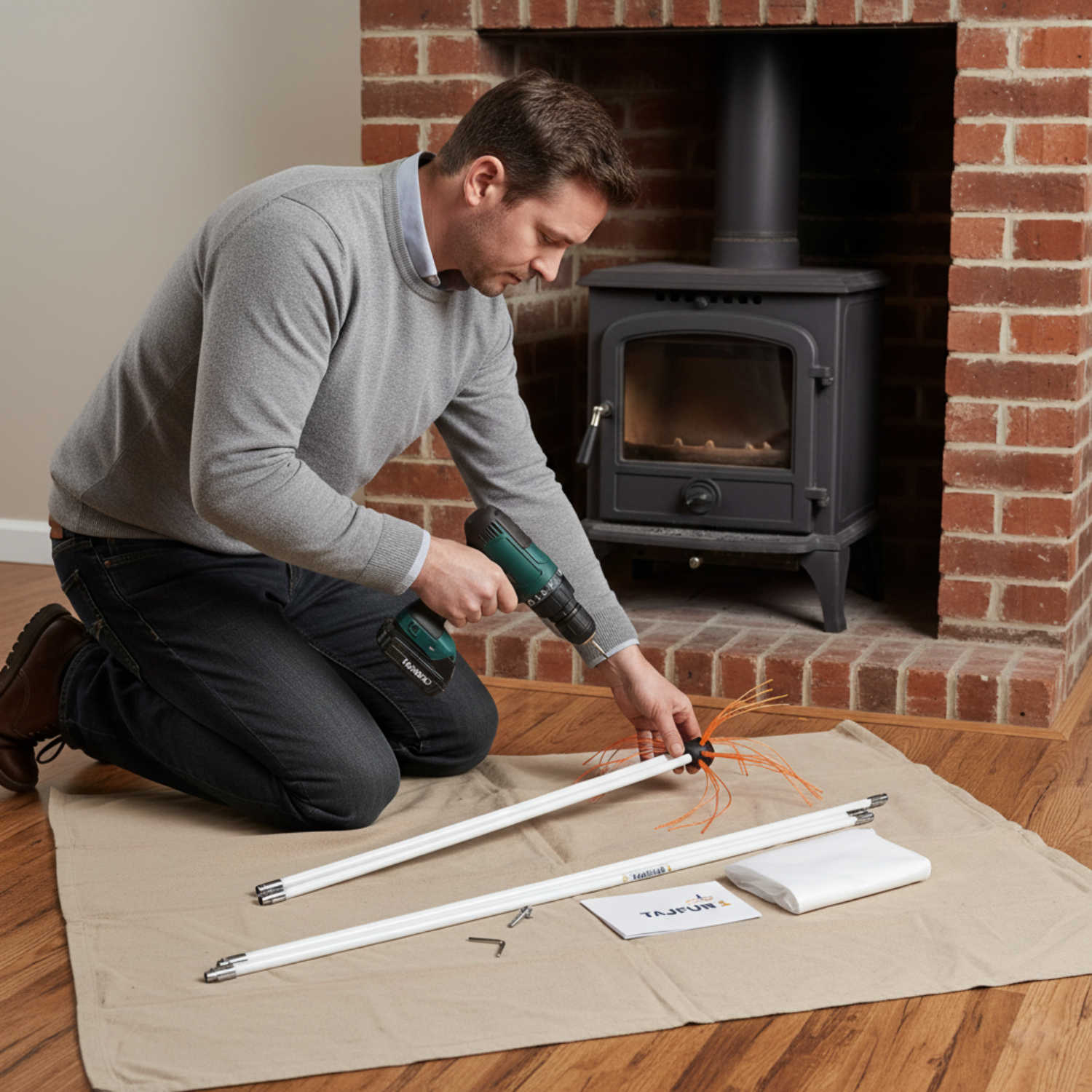 Set TAJFUN 6 m jednostavan je za sastavljanje i korištenje. Pričvrstite četku na običnu bušilicu, umetnite je u dimnjak i počnite rotirati. Zaštitna folija smanjuje količinu prašine, čineći čišćenje brzim, praktičnim i sigurnim. Set se može koristiti više puta.