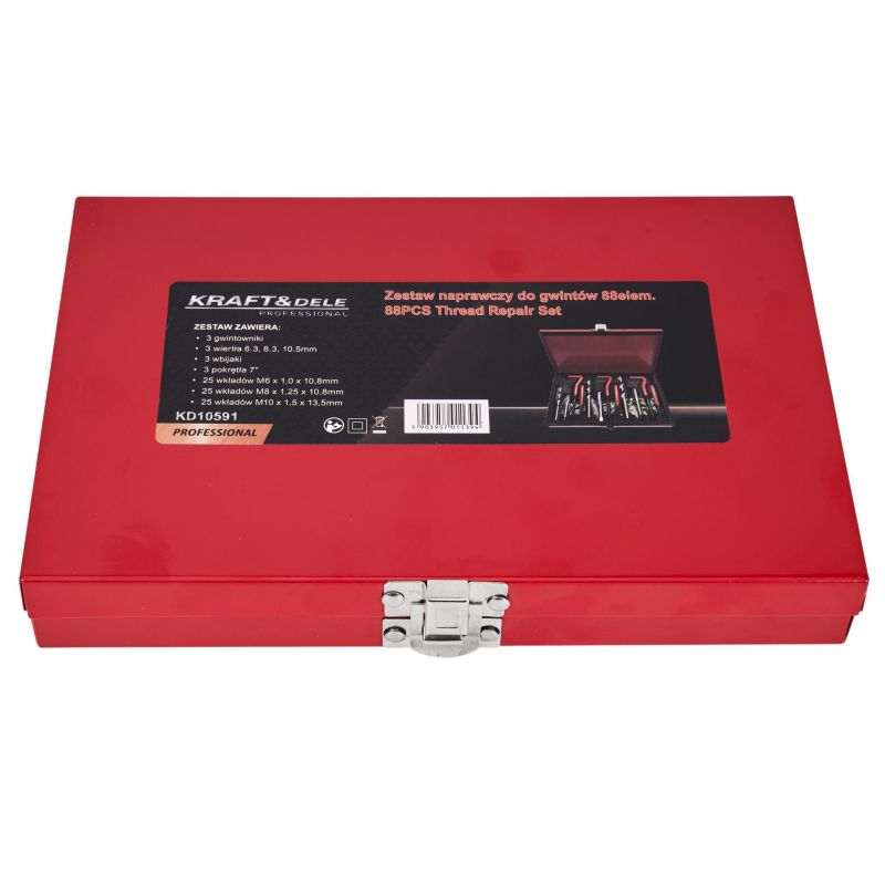 Set za popravak navoja, 88 komada | KD10591 sadrži elemente izrađene od najkvalitetnijeg kaljenog čelika, dokazat će se u svakoj radionici i garaži. Set se koristi za popravak navojnih spojeva svih vrsta u većini materijala. Zahvaljujući velikom broju elemenata, set je vrlo svestran. Svi alati izrađeni su od najkvalitetnijih materijala – visokokvalitetnog HSS čelika. To jamči izdržljivost tijekom dugotrajne upotrebe u radionici. Cijeli set pakiran je u čvrstu metalnu kutiju s namjenskim mjestima za svaki alat kako bi sve bilo uredno.