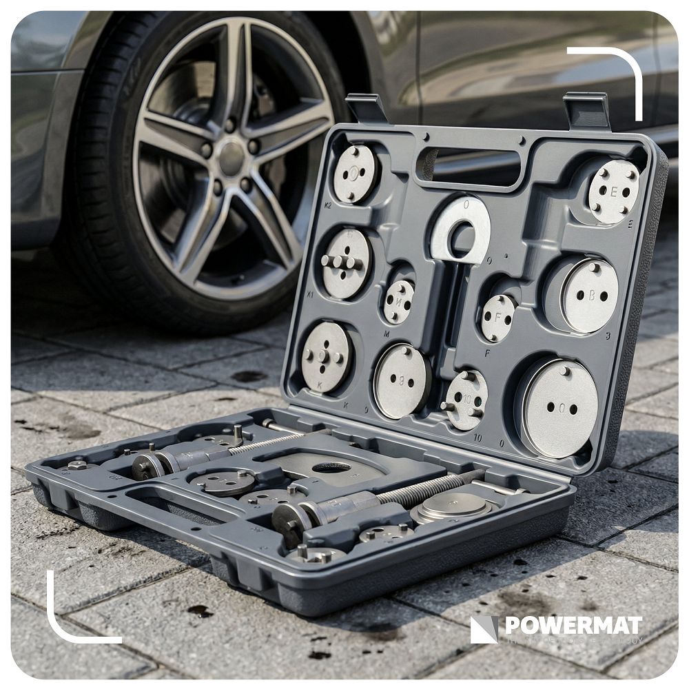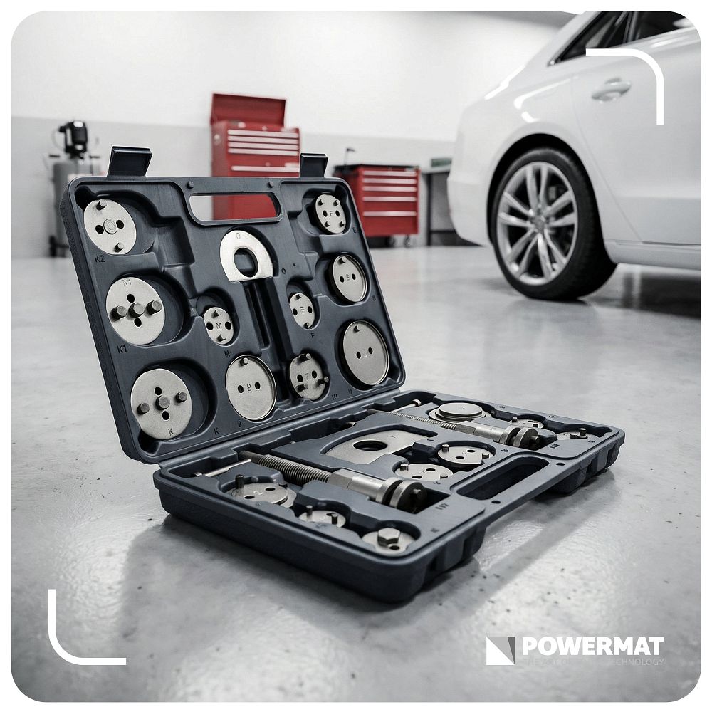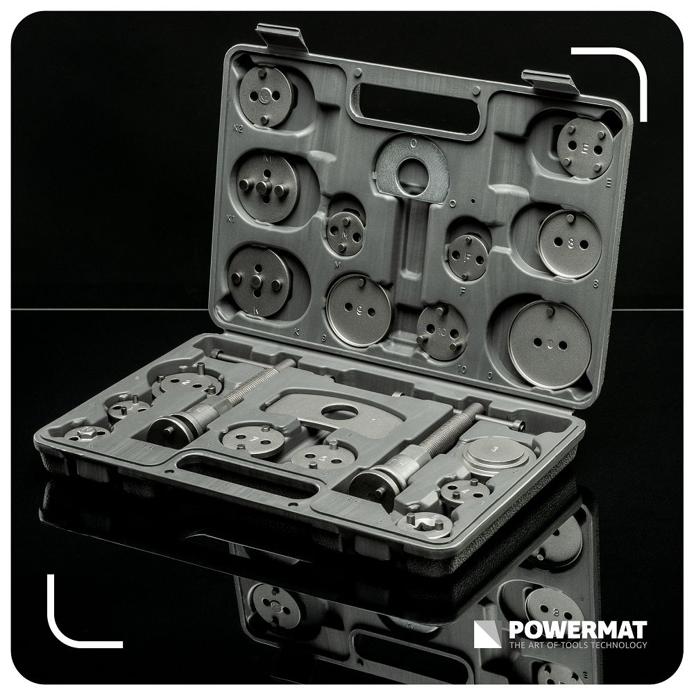 Set za prešanje kočionih klipova, 22 komada | PM-ZWT-22T uključuje alate za istiskivanje klipova prilikom zamjene kočionih pločica. Zahvaljujući mnogim adapterima, alat možete prilagoditi različitim modelima. Desnoruke i lijevoruke preše povećavaju udobnost rada. Dobivate preciznost, uštedu vremena i manji rizik od oštećenja. Desnoruki i lijevi navoji omogućuju vam rad u skladu s dizajnom klipa bez rizika od oštećenja. Zahvaljujući tome, servis obavljate točno i bez nepotrebnog napora.