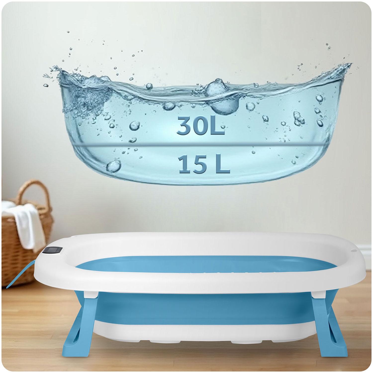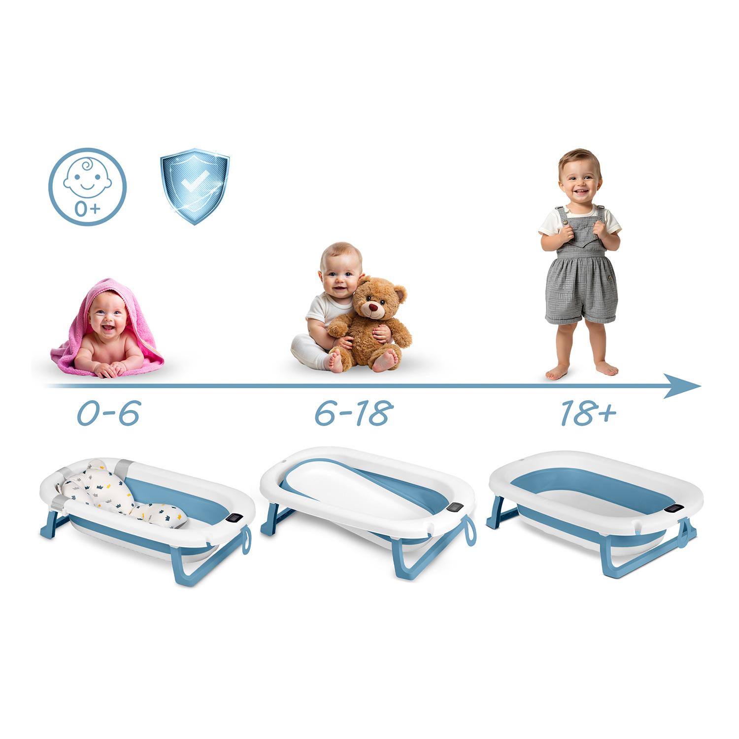 Sklopiva dječja kada s termometrom RK-287 | plava nudi sigurno i udobno kupanje, a može se sklopiti i pohraniti čak i u manjem prostoru. Kada je opremljena mekim, oblikovanim umetkom koji nježno podupire glavu i leđa vašeg djeteta. Zahvaljujući trima jakim ručkama, možete ga sigurno pričvrstiti na rubove kade – bez klizanja, bez stresa.