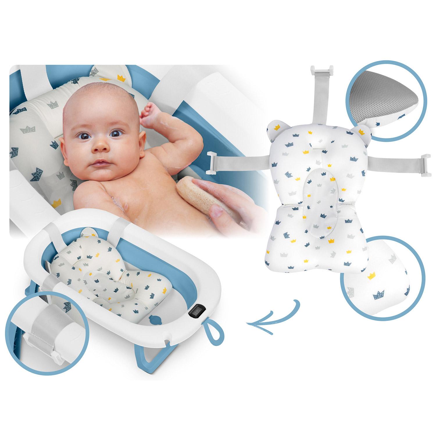 Umetak je izrađen od brzosušećeg materijala, tako da ga možete izvaditi nakon kupanja i brzo osušiti. Kada je opremljena integriranim termometrom koji pomaže roditeljima da kontroliraju temperaturu vode i spriječe pregrijavanje ili hipotermiju bebe. Još jedna prednost je ugrađeni držač za glavu tuša, što kupanje čini izuzetno ugodnim i sigurnim.